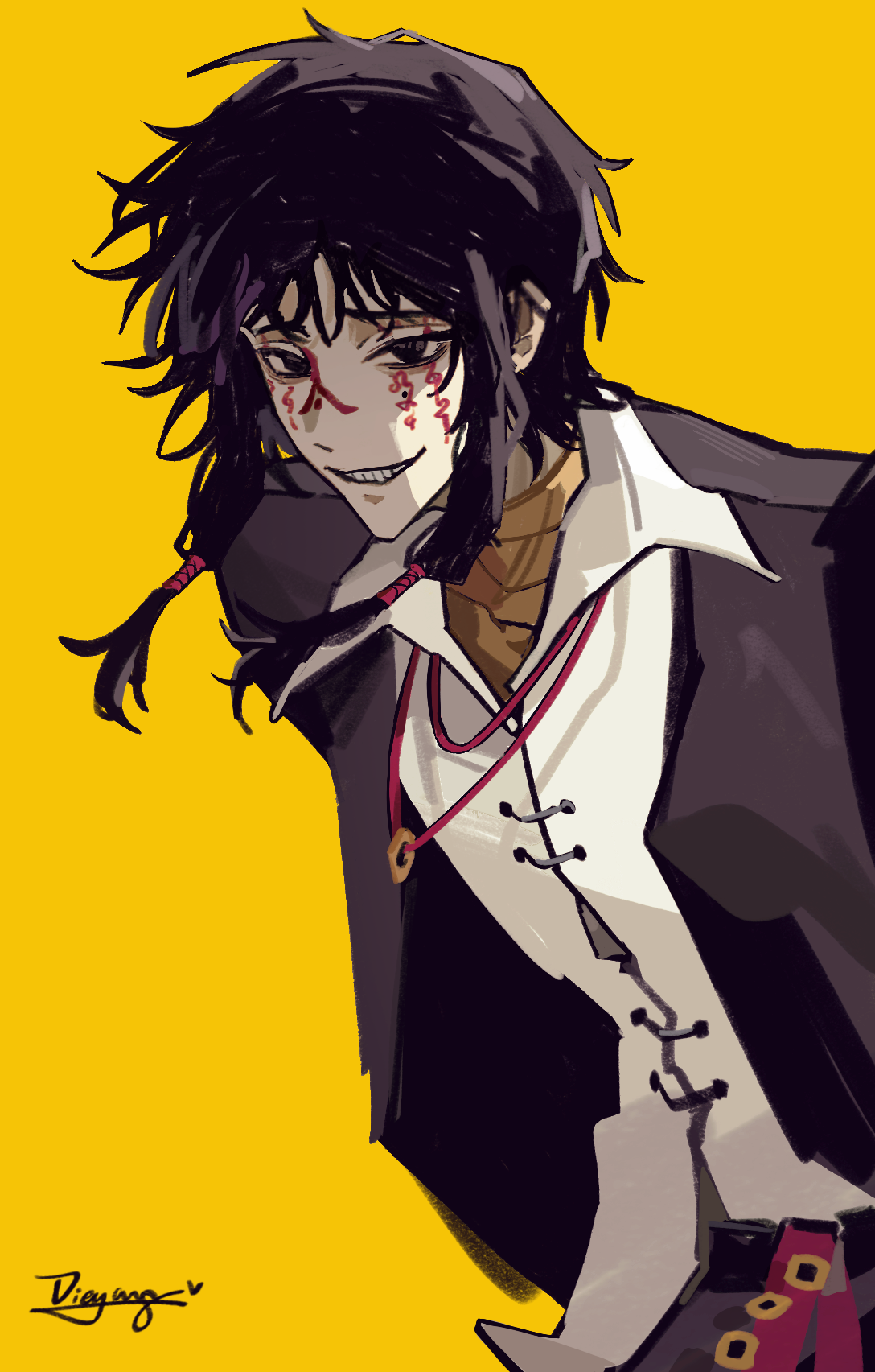 1boy black_eyes black_hair black_jacket chinese_commentary coin coin_on_string collared_shirt commentary_request facepaint grin highres holed_coin jacket male_focus open_clothes open_jacket shangyisao shirt short_hair_with_long_locks sidelocks simple_background smile solo touqi_guaitan upper_body white_shirt yellow_background ziche_fuzhao