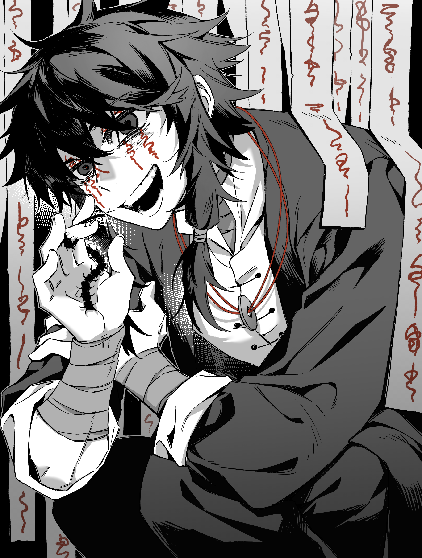 1boy bandaged_wrist bandages bug centipede chinese_commentary coin coin_on_string commentary_request facepaint greyscale hair_between_eyes highres holed_coin jacket jiwai long_sleeves male_focus monochrome open_clothes open_jacket open_mouth short_hair_with_long_locks sidelocks smile solo spot_color touqi_guaitan ziche_fuzhao
