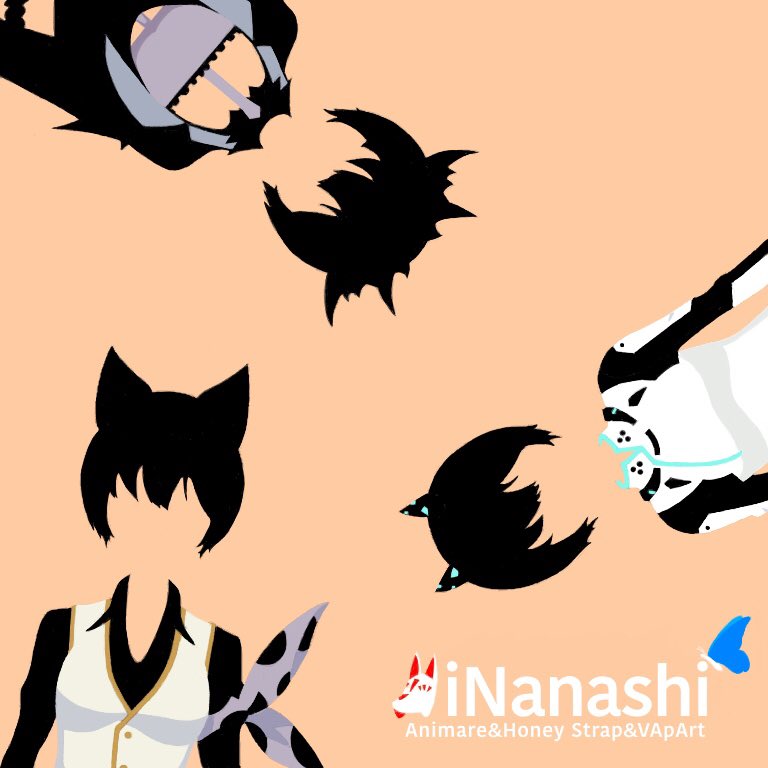 12_shichou 3girls animal_ears arm_ribbon black_footwear black_hair black_jacket black_ribbon blending blue_butterfly breasts bug butterfly character_name collared_shirt commentary_request copyright_name crop_top cropped_jacket faceless flat_color fox_mask ginneko_nanashi haineko_nanashi insect jacket kuroneko_nanashi limited_palette long_sleeves lying mask medium_breasts multicolored_hair multiple_girls nanashi_inc. necktie no_lineart on_back open_collar orange_background polka_dot polka_dot_ribbon purple_necktie purple_ribbon purple_shirt ribbon shirt short_hair simple_background two-tone_ribbon upper_body vest virtual_youtuber white_jacket white_vest