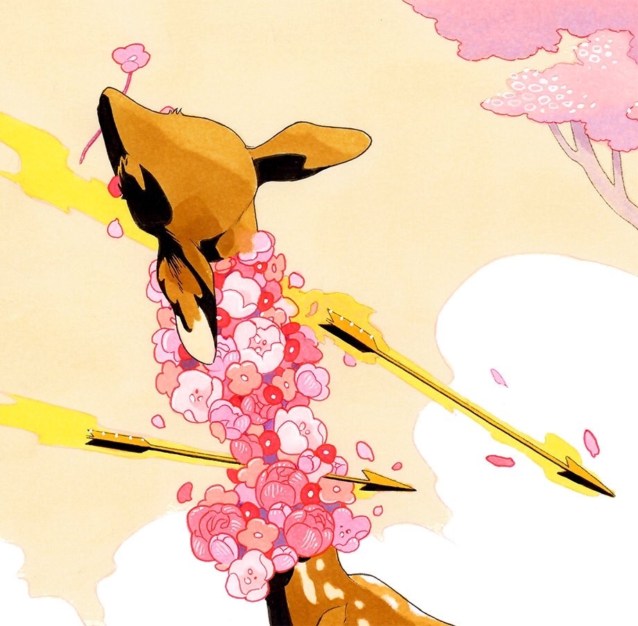 animal animal_focus arrow_(projectile) arrow_in_body baby_animal brown_fur cloud cropped crying day deer falling_petals fawn fleebites flower flower_in_mouth head_back limited_palette neck_flower no_humans original outdoors pastel_colors petals pink_flower pink_petals sky stretching symbolism traditional_media tree yellow_light yellow_sky