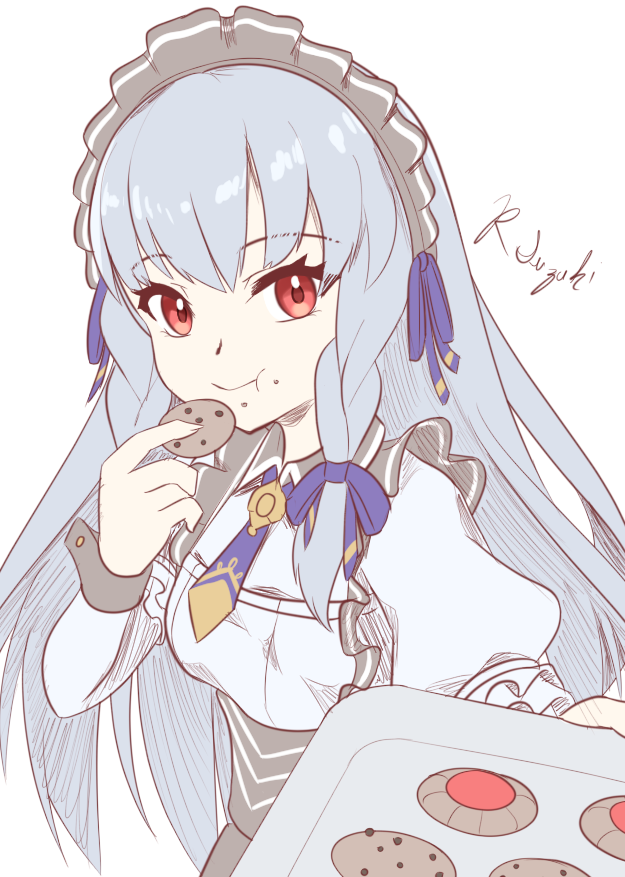 1girl baking_sheet black_headdress chewing commentary cookie english_commentary eyelashes fire_emblem fire_emblem:_three_houses food grey_hair holding holding_cookie holding_food holding_tray long_hair looking_at_viewer lysithea_von_ordelia lysithea_von_ordelia_(tea_party) nintendo red_eyes ryo_suzuki signature simple_background smile solo tray white_background