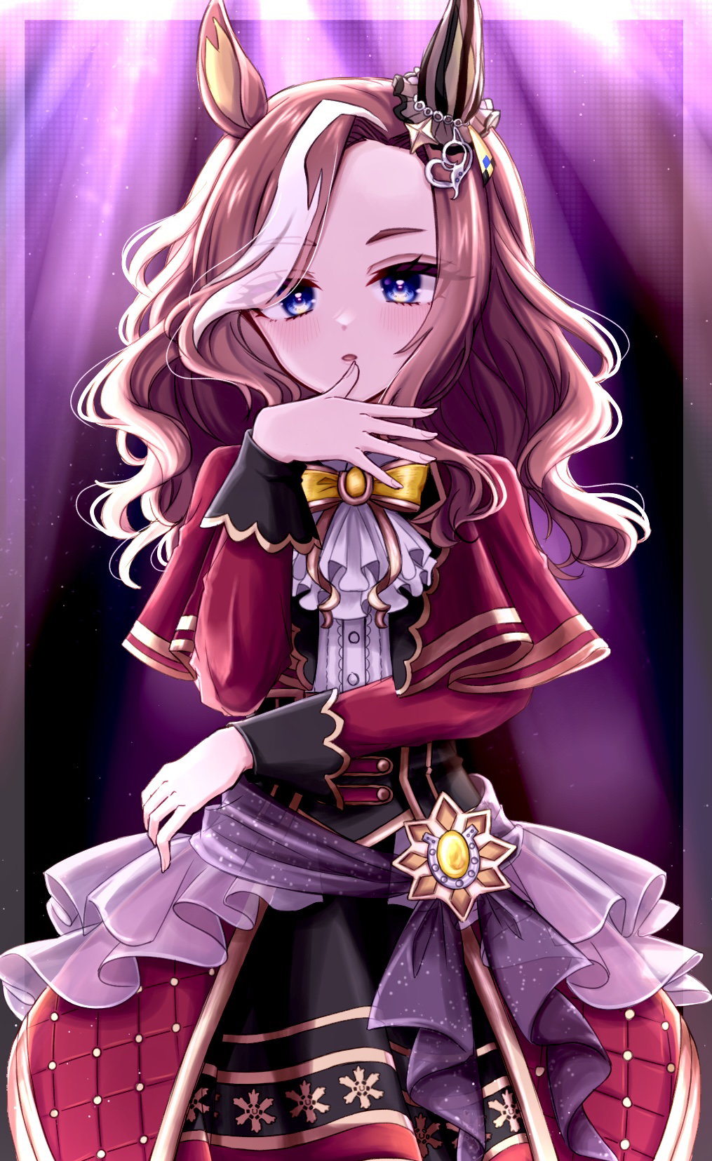 1girl alternate_costume animal_ears blue_eyes blush breasts brown_hair commentary_request daring_heart_(umamusume) forehead gem hair_ornament highres horse_ears horse_girl looking_at_viewer notes_of_grandeur_(umamusume) open_mouth ribbon sash simple_background solo stage tyamu_mu umamusume