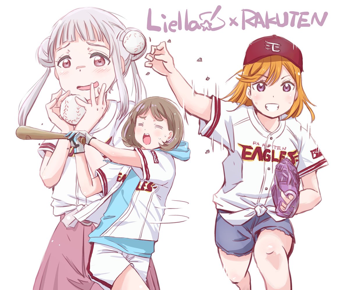 3girls arashi_chisato arched_bangs ball baseball_(object) baseball_bat baseball_cap baseball_glove baseball_uniform black_shorts blue_hoodie blush brown_hair cowboy_shot double_bun feet_out_of_frame gloves grin group_name hair_bun hashtag-only_commentary hat holding holding_ball holding_baseball_bat hood hood_down hoodie love_live! love_live!_superstar!! maruyo multiple_girls nippon_professional_baseball open_clothes open_mouth open_shirt orange_hair pink_skirt pitching purple_eyes red_hat shibuya_kanon shirt short_hair short_sleeves shorts simple_background skirt smile sportswear tang_keke tied_shirt touhoku_rakuten_golden_eagles v-shaped_eyebrows white_background white_gloves white_hair white_shirt white_shorts
