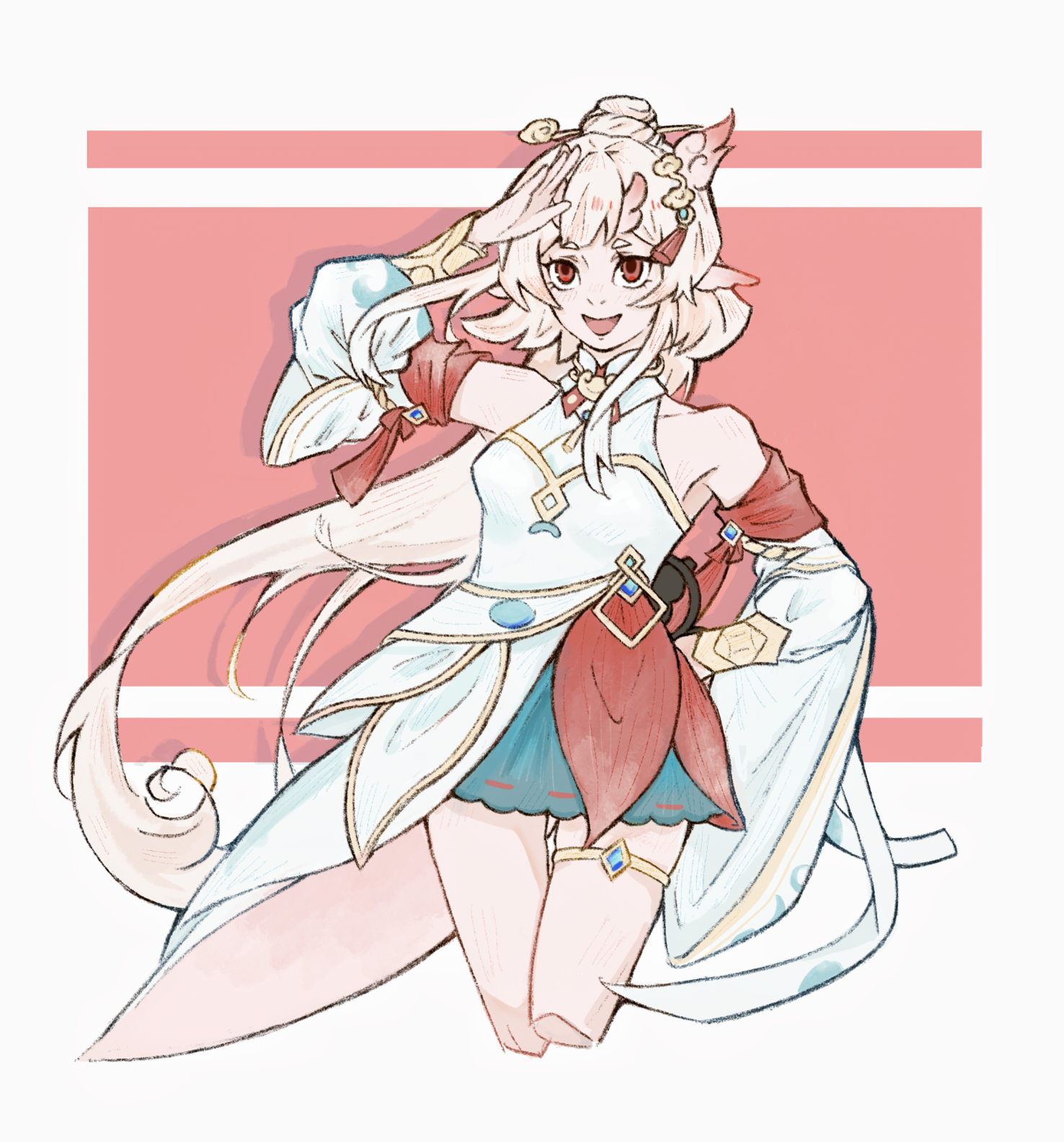 1girl bad_source detached_sleeves dragon_horns dress eastern_dragon_horns hair_ornament hand_on_own_hip highres long_hair looking_at_viewer open_mouth original pointy_ears red_eyes salute skirt smile solo tianye_yuan very_long_hair virtual_youtuber