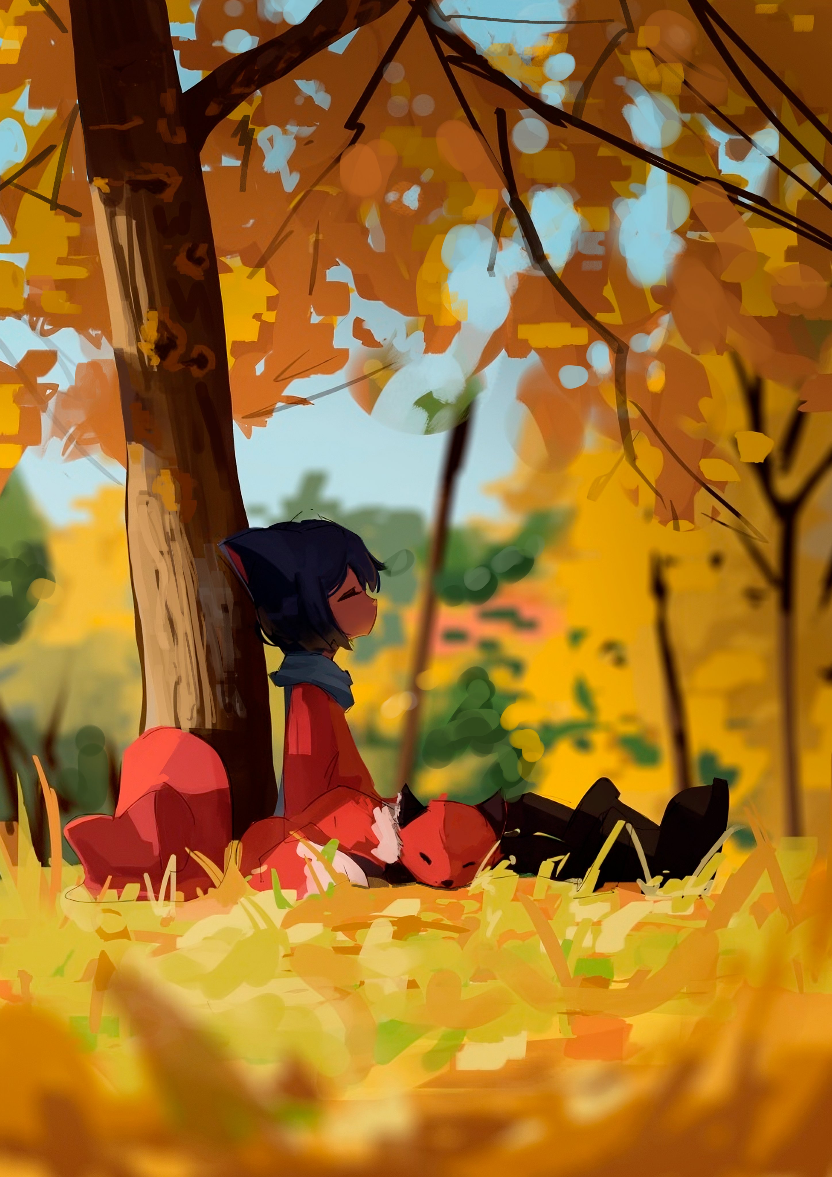 1girl 1other absurdres androgynous animal_ear_headwear animal_ears animal_hat autumn autumn_leaves blue_scarf blurry blurry_background brown_poncho brown_tunic cat_ears cat_hat fake_animal_ears forest fox hat highres leaf long_sleeves nature niko_(oneshot) oneshot_(game) rue_(oneshot) scarf shadches72 short_hair sitting tunic