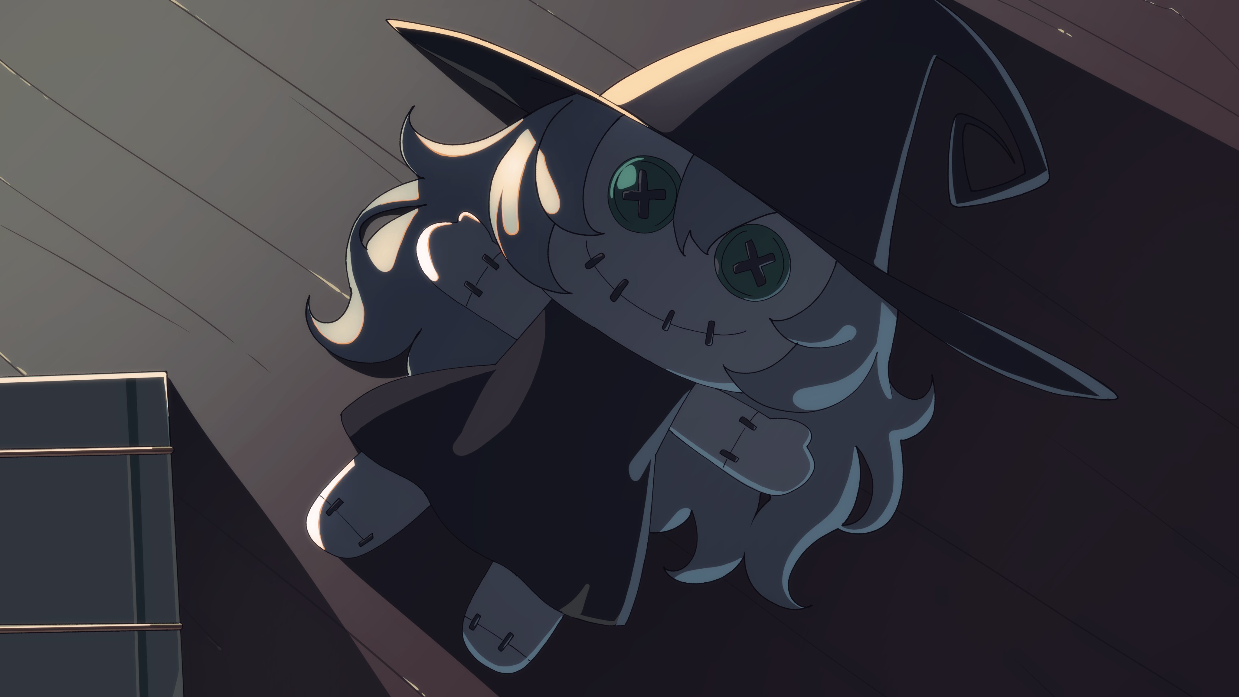 1girl absurdres black_dress button_eyes buttons character_doll curly_hair doll dress grey_hair hat highres kuroi_enpitsu long_hair smile solo virtual_youtuber vshojo witch witch_hat zentreya zentreya_(witch)