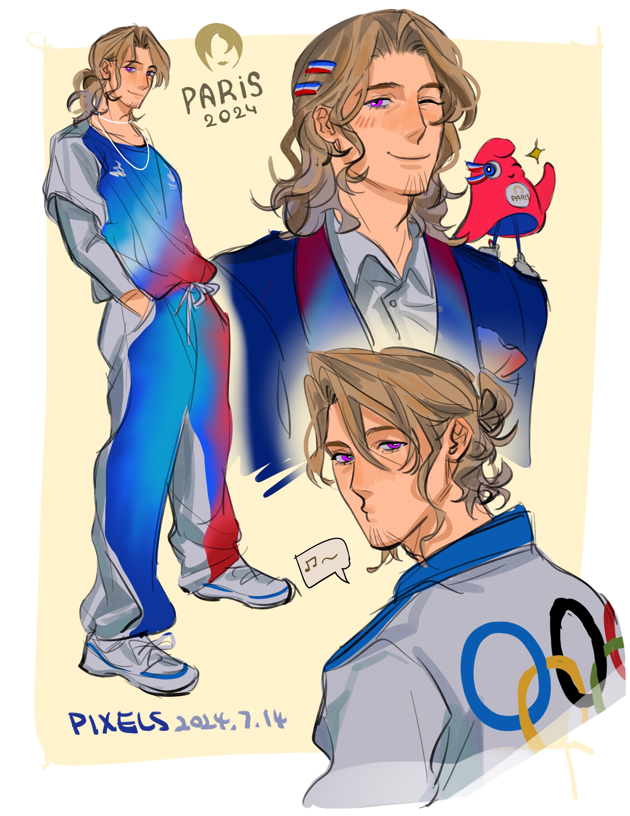 1boy 2024_summer_olympics absurdres axis_powers_hetalia blonde_hair facial_hair france_(hetalia) french_flag goatee_stubble half_updo hands_in_pockets highres jacket male_focus medium_hair multiple_views musical_note olympic_phryge olympics one_eye_closed pink_eyes pixels_(penelopejo18155) ponytail shoes sneakers spoken_musical_note sportswear stubble track_suit wavy_hair