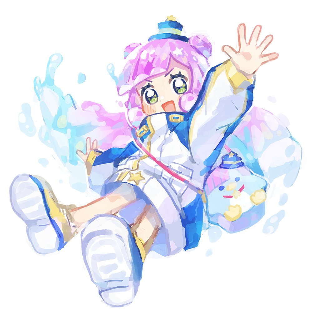 1girl :d animal_bag arm_up blue_hair blue_hat blush double_bun full_body gradient_hair green_eyes hair_bun hat jacket long_hair long_sleeves looking_at_viewer mini_hat mini_top_hat monster_girl multicolored_hair open_mouth puniru_(puniru_wa_kawaii_slime) puniru_wa_kawaii_slime purple_hair shoe_soles shoes simple_background slime_girl smile solo standing ting_come top_hat v-shaped_eyebrows white_background yellow_shoes
