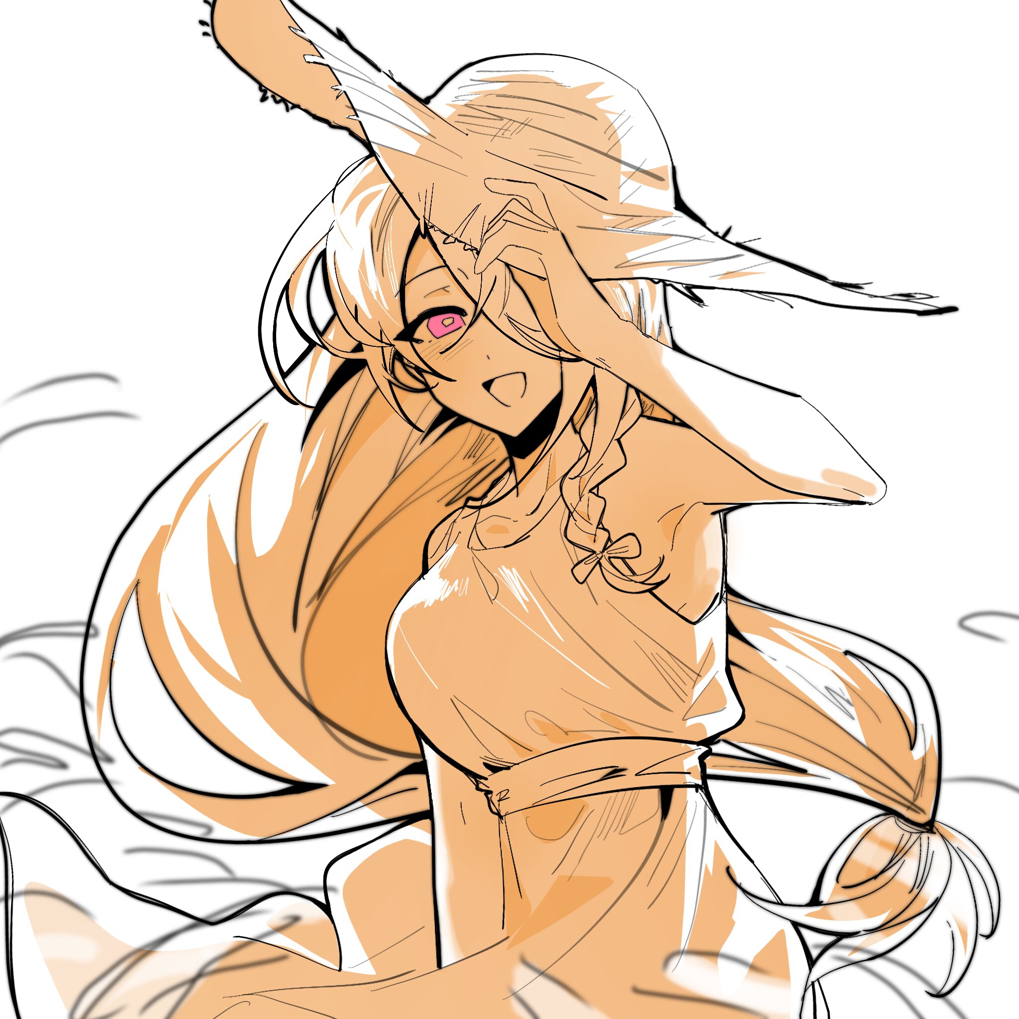 1girl braid breasts hair_over_one_eye happy hat heaven_burns_red highres jingbai968 kura_satomi large_breasts long_hair multiple_girls partially_colored red_eyes solo straw_hat