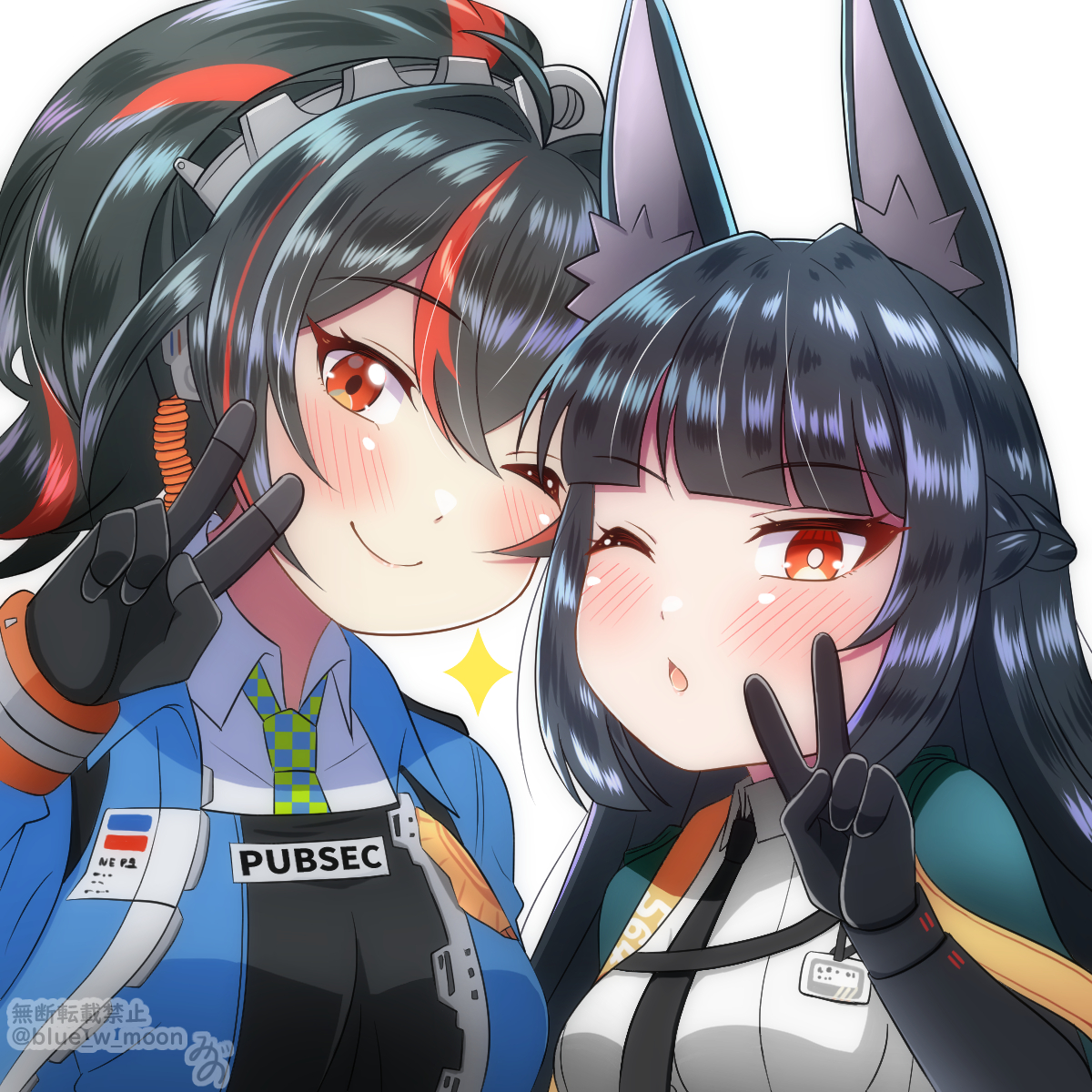 2girls animal_ear_fluff animal_ears black_gloves black_hair black_necktie blue_jacket blue_w_moon blunt_bangs blush closed_mouth fox_ears fox_girl gauntlets gloves hair_between_eyes hairband highres hoshimi_miyabi jacket long_hair metal_hairband multicolored_hair multiple_girls necktie one_eye_closed open_mouth orange_eyes orange_hair police police_uniform policewoman red_eyes sidelocks simple_background sparkle streaked_hair two-tone_hair v white_background zenless_zone_zero zhu_yuan