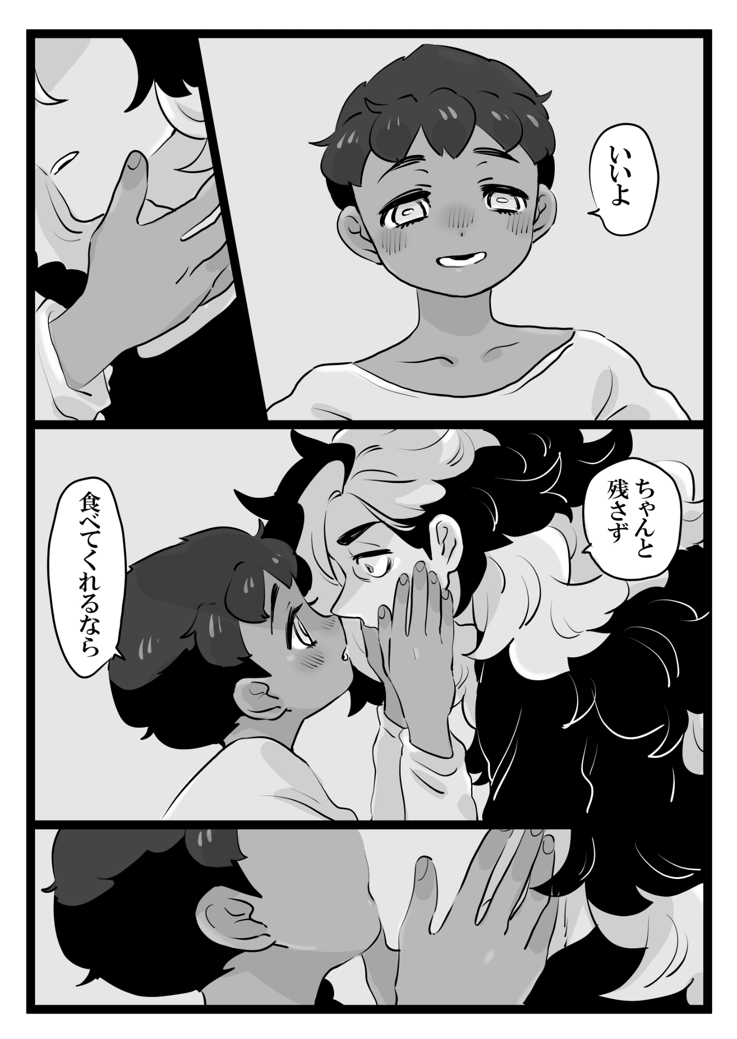 2boys age_difference amagaeru_(amapippi052525) black_hair dark-skinned_male dark_skin greyscale highres hop_(pokemon) kiss long_hair monochrome multicolored_hair multiple_boys nintendo onii-shota piers_(pokemon) pokemon pokemon_sword_and_shield ponytail short_hair speech_bubble translated two-tone_hair white_hair yaoi