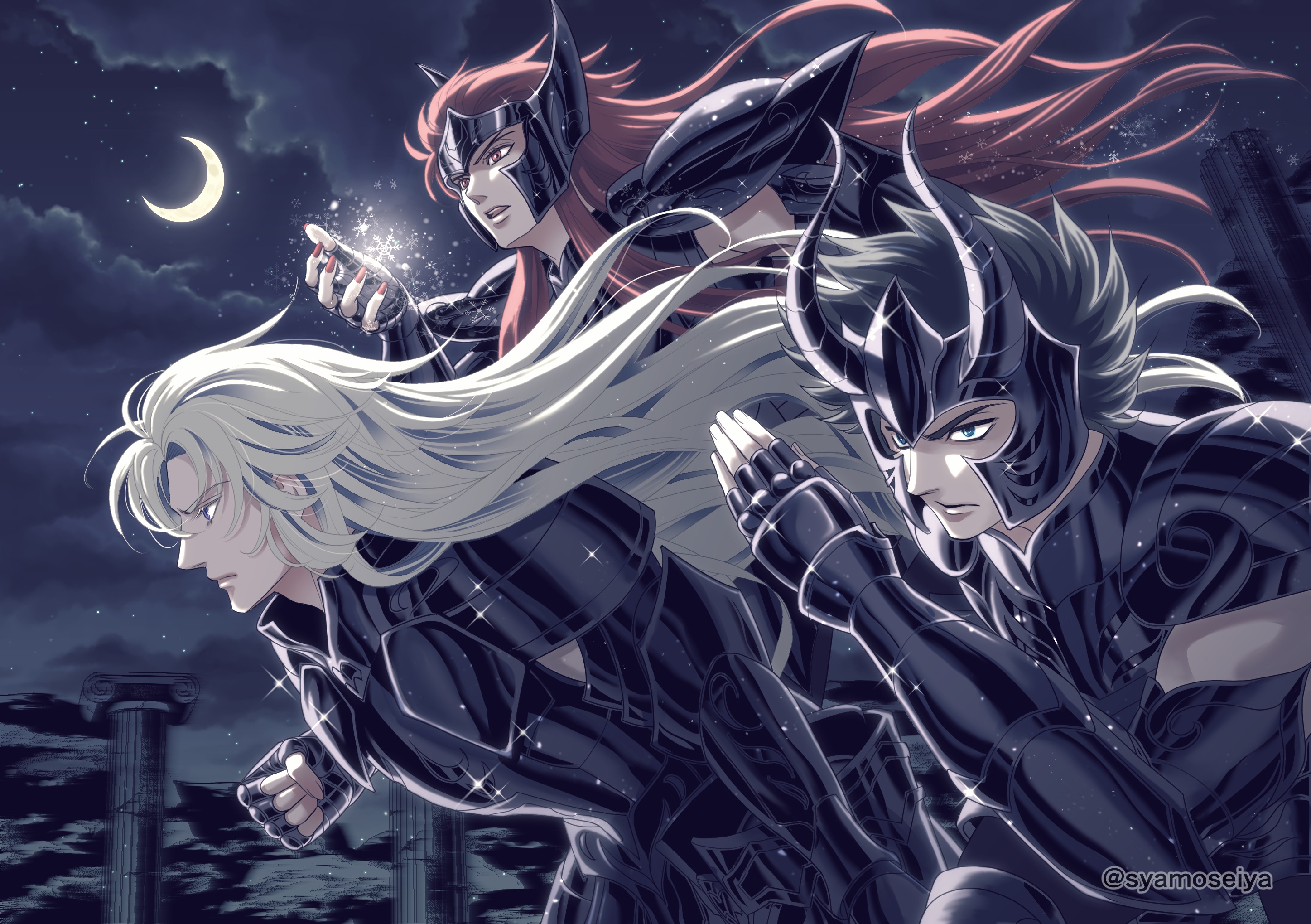 3boys aquarius_camus armor black_armor black_hair blonde_hair blue_eyes capricorn_shura clenched_hand cloud crescent_moon cryokinesis dark_persona fake_horns fingernails from_side gemini_saga hand_up helmet highres horned_helmet horns long_hair long_sidelocks male_focus moon multiple_boys nail_polish night open_mouth pillar profile red_eyes red_hair red_nails saint_seiya serious short_hair sidelocks sky snowflakes sparkle star_(sky) syamojimon teeth upper_teeth_only
