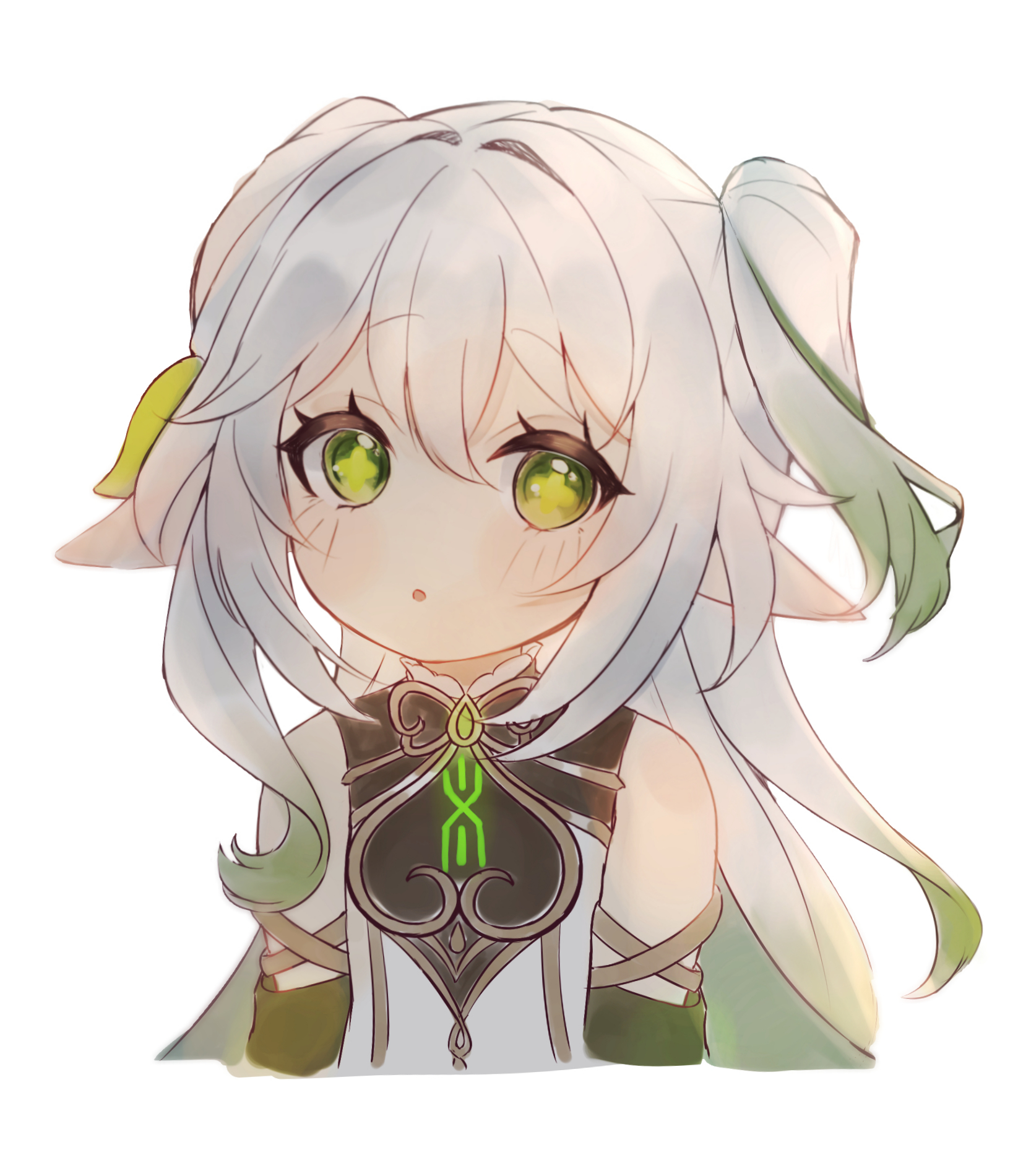 1girl :o bare_shoulders blush cape commentary cropped_torso detached_sleeves genshin_impact gold_trim gradient_hair green_cape green_eyes green_hair green_sleeves hair_between_eyes highres iroha_(mimi0618xx) leaf long_hair looking_at_viewer multicolored_hair nahida_(genshin_impact) open_mouth pointy_ears simple_background solo symbol-shaped_pupils white_background white_hair