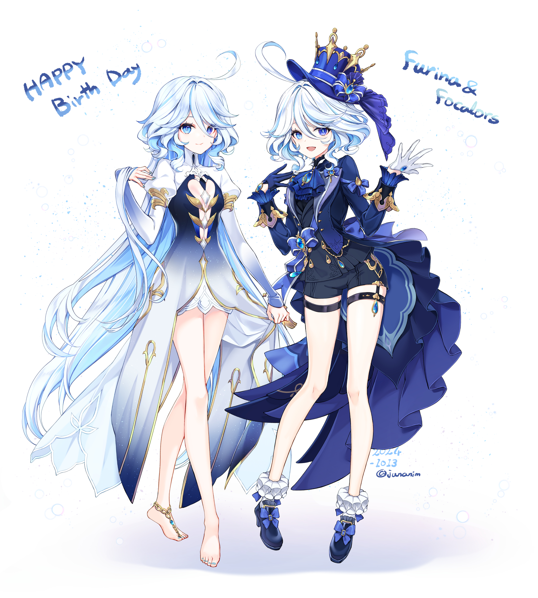 2girls :d ahoge artist_name ascot asymmetrical_gloves barefoot black_shorts blue_ascot blue_bow blue_dress blue_eyes blue_footwear blue_gloves blue_hair blue_hat blue_jacket blue_nails blue_pupils blue_ribbon bow character_name closed_mouth commentary_request dated dress drop-shaped_pupils english_text fingernails focalors_(genshin_impact) full_body furina_(genshin_impact) genshin_impact gloves gradient_clothes gradient_dress hair_between_eyes happy_birthday hat hat_bow hat_ribbon heterochromia highres holding_own_dress hydro_symbol_(genshin_impact) jacket juna korean_commentary light_blue_hair long_hair long_sleeves looking_at_viewer medium_hair mismatched_gloves multicolored_hair multiple_girls nail_polish open_mouth ouji_fashion ribbon shorts smile streaked_hair symbol-shaped_pupils thigh_strap toenail_polish toenails very_long_hair vision_(genshin_impact) white_background white_dress white_gloves white_hair