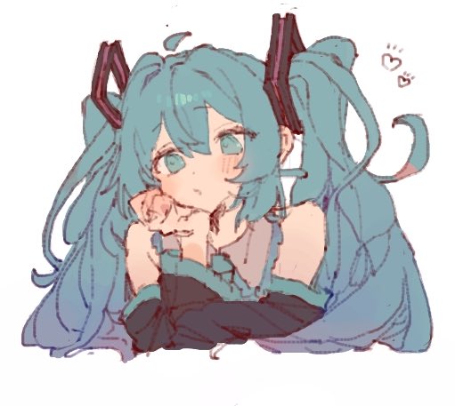 1girl aqua_eyes aqua_hair bare_shoulders black_sleeves blush bunchi detached_sleeves grey_shirt hair_between_eyes hair_ornament hatsune_miku head_rest heart long_hair looking_at_viewer oekaki open_mouth shirt simple_background sleeveless sleeveless_shirt solo twintails upper_body very_long_hair vocaloid white_background