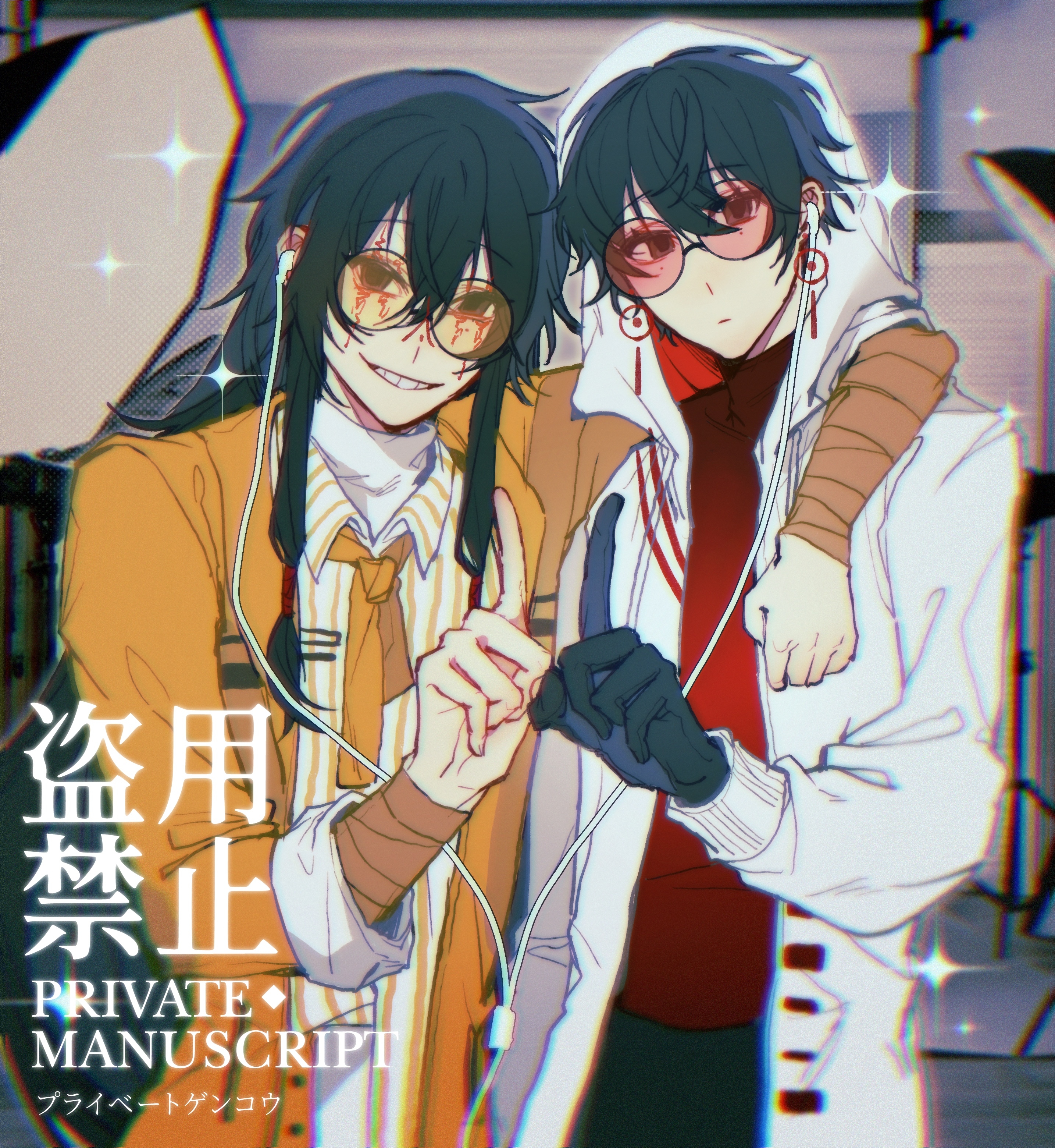 2boys absurdres arm_around_shoulder bandaged_arm bandages black_eyes black_gloves black_hair chinese_commentary chromatic_aberration closed_mouth coat collared_shirt commentary_request commission earphones expressionless facepaint gloves grin hair_between_eyes highres hood hood_up hooded_coat index_finger_raised jacket li_yuting_(male) lili_buxiang_dong long_sleeves male_focus mole mole_under_each_eye mole_under_eye multiple_boys multiple_moles open_clothes open_coat open_jacket red_shirt round_eyewear shared_earphones shirt short_hair_with_long_locks sidelocks smile sparkle striped_clothes striped_shirt tinted_eyewear touqi_guaitan two-sided_coat two-sided_fabric vertical-striped_clothes vertical-striped_shirt watermark white_shirt yellow-tinted_eyewear yellow_jacket ziche_fuzhao