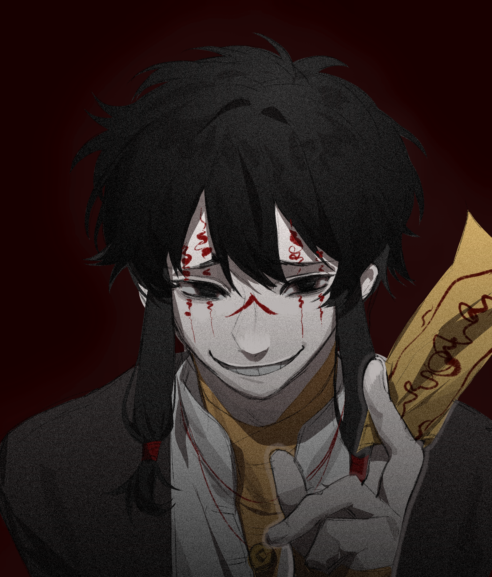 1boy black_eyes black_hair black_jacket caveman_(cavemannnnn) chinese_commentary commentary_request film_grain from_above grin highres holding holding_ofuda jacket low-tied_sidelocks male_focus ofuda open_clothes open_jacket portrait red_background shirt short_hair_with_long_locks sidelocks simple_background smile solo touqi_guaitan white_shirt ziche_fuzhao