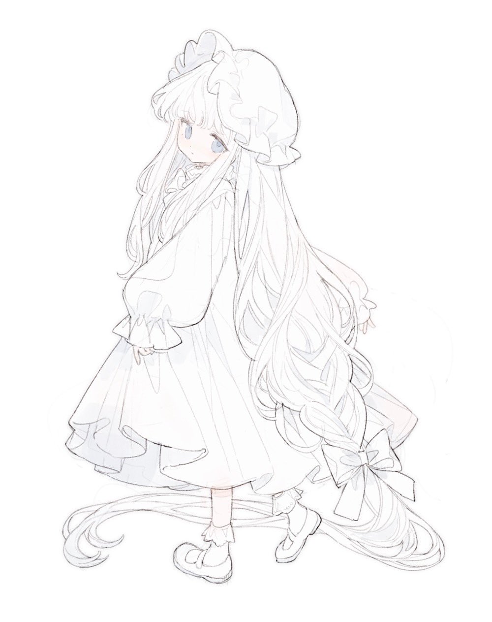1girl absurdly_long_hair blunt_bangs bow bowtie braid closed_mouth clothes_lift dot_nose dress dress_lift expressionless frilled_socks frills full_body greyscale hair_bow hat highres koirariko long_hair long_sleeves looking_at_viewer mary_janes mob_cap monochrome original puffy_long_sleeves puffy_sleeves shoes sidelocks simple_background single_braid socks solo very_long_hair white_background