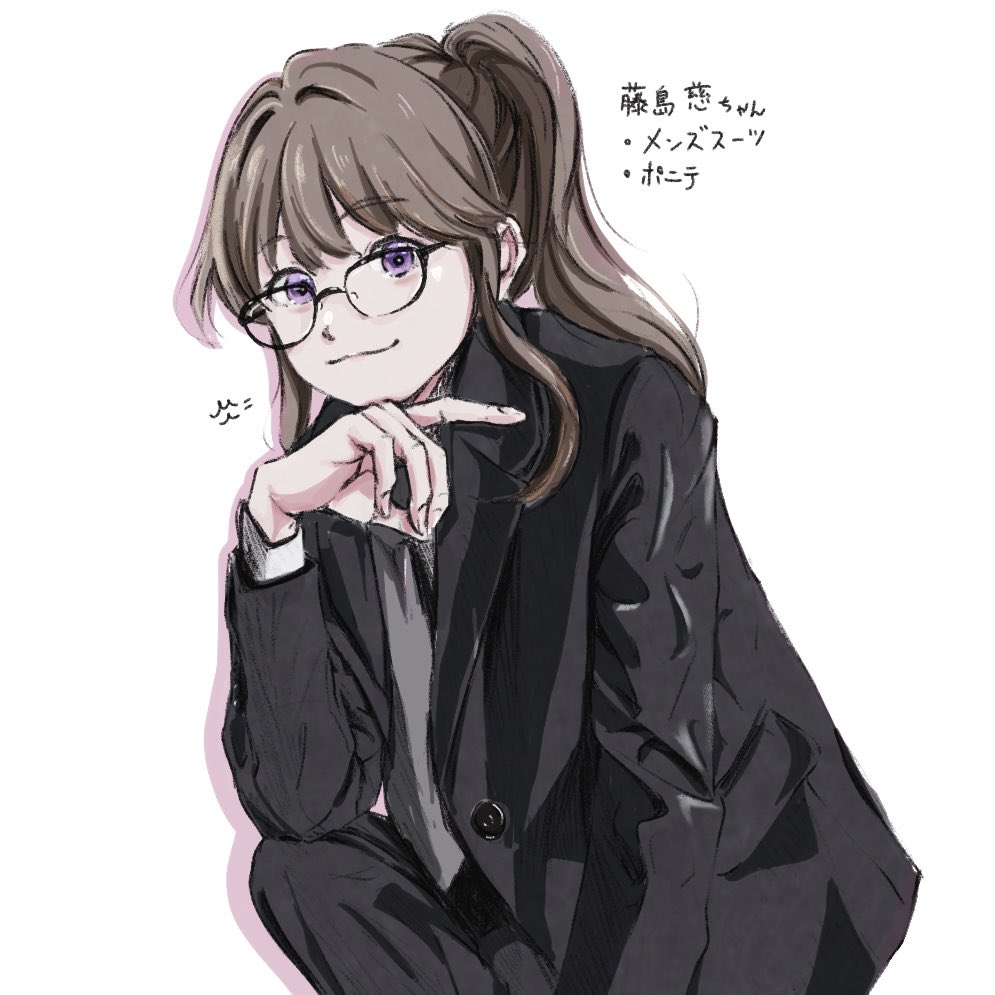 1girl alternate_costume alternate_hairstyle black-framed_eyewear black_jacket black_pants black_suit brown_hair closed_mouth commentary_request crossdressing crossdressing_(ftm) formal_clothes fujishima_megumi glasses grey_necktie hand_up high_ponytail jacket link!_like!_love_live! long_hair long_sleeves looking_at_viewer love_live! mame_orca necktie open_clothes open_jacket pants ponytail purple_eyes shirt simple_background smile solo suit suit_jacket swept_bangs translation_request virtual_youtuber white_background white_shirt
