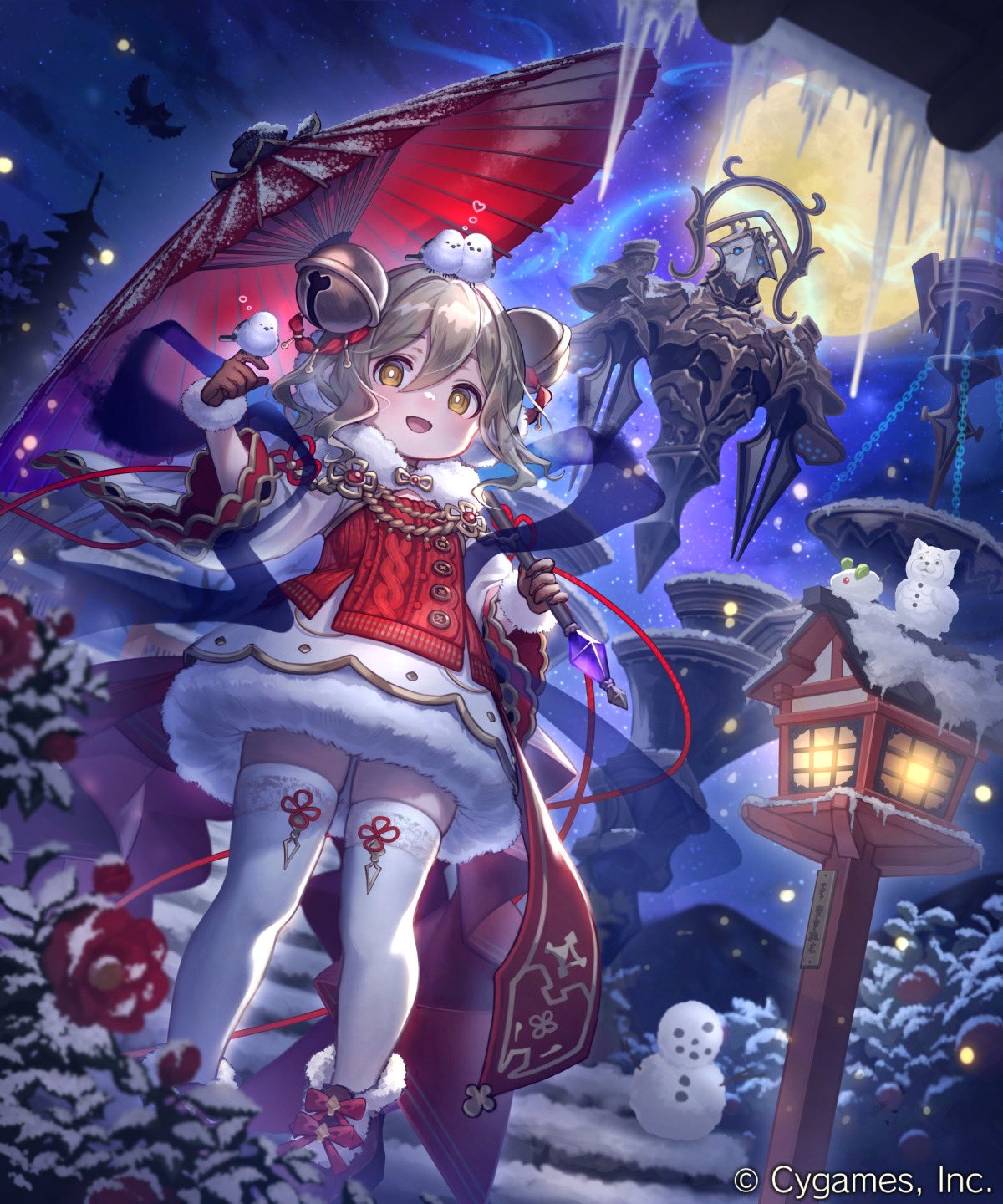 1girl animal animal_on_head architecture armor bell bird bird_on_hand bird_on_head blue_eyes blush breastplate brown_eyes brown_footwear brown_gloves brown_hair commentary_request company_name curly_hair dress east_asian_architecture fireflies floating floating_object flower flying foliage gloves hagoromo hair_bell hair_between_eyes hair_ornament hand_up heart helmet highres holding holding_umbrella ice ines_(shadowverse) japanese_clothes jingle_bell lamp living_armor looking_at_viewer medium_hair mew_cat_1091 moon mountain multiple_others nature night official_art oil-paper_umbrella on_head open_mouth outdoors red_flower red_sweater red_umbrella shadowverse shawl shoes shoulder_armor sky smile snow snowman stairs standing star_(sky) sweater thighhighs umbrella white_dress white_thighhighs wide_sleeves winter zettai_ryouiki