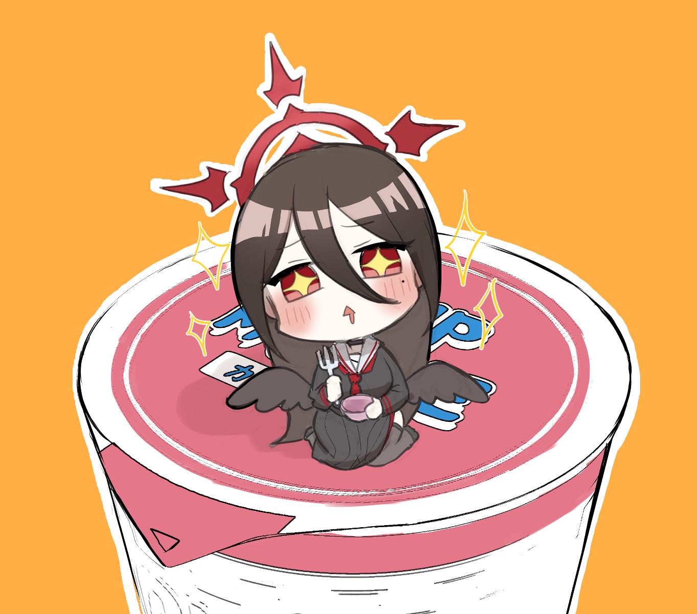 +_+ 1girl bad_link bad_reddit_link black_choker black_serafuku black_thighhighs black_wings blue_archive blush chibi choker drooling emirio_(emirio110) feathered_wings food fork hair_between_eyes halo happy happy_aura hasumi_(blue_archive) highres holding holding_food holding_fork long_sleeves looking_at_viewer low_wings mole mole_under_eye neckerchief open_mouth orange_background pleated_skirt red_eyes red_halo red_neckerchief school_uniform serafuku side_slit sitting sitting_on_food skirt solo sweat thighhighs triangle_mouth wariza wings