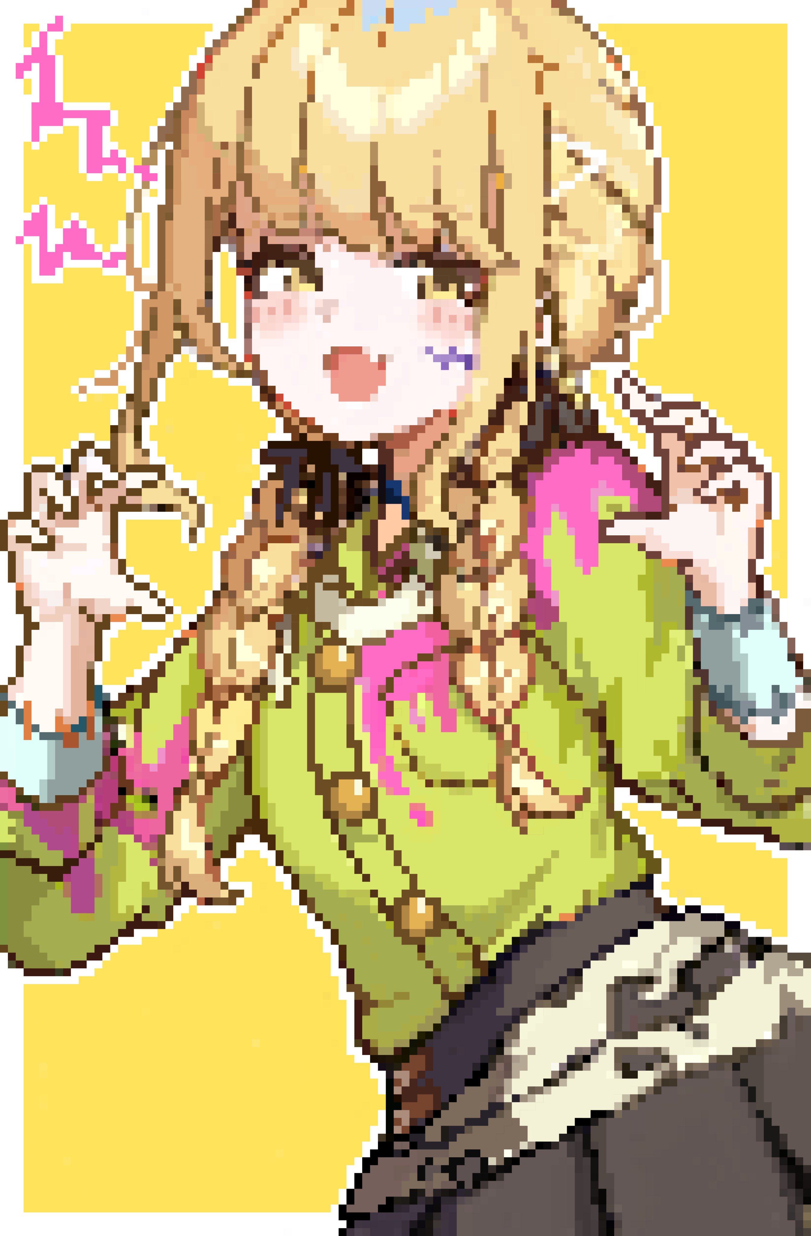1girl absurdres armband black_ribbon blonde_hair blue_armband blush border bow braid breasts claw_pose cowboy_shot fang from_side fujita_kotone gakuen_idolmaster green_shirt grey_skirt hair_bow hair_ribbon hands_up highres idolmaster long_hair long_sleeves looking_at_viewer open_mouth outside_border paint_on_clothes pixel_art pleated_skirt ribbon shiro_wa_(shiroshironix) shirt simple_background skirt small_breasts smile solo standing twin_braids white_border yellow_background yellow_eyes