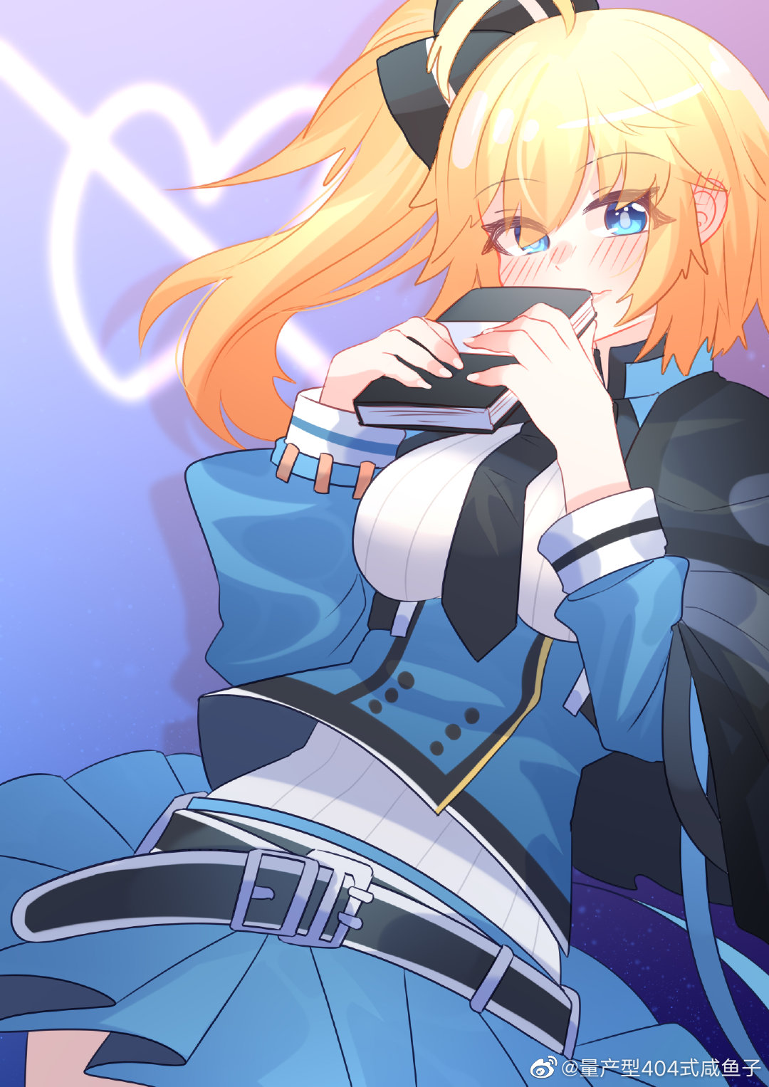 1girl ahoge belt black_bow black_necktie blonde_hair blue_eyes blue_skirt blush bogue_(warship_girls_r) book bow breasts eyes_visible_through_hair hair_bow heterochromia highres holding jacket liangchanxing404xianyizi long_hair looking_at_viewer necktie side_ponytail simple_background skirt smile solo warship_girls_r watermark weibo_watermark yellow_eyes