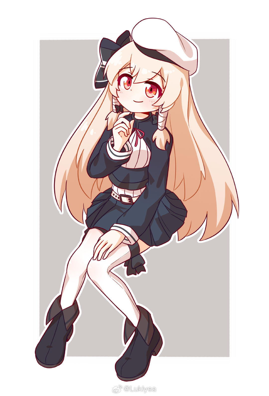 1girl belt belt_buckle beret black_boots black_bow black_jacket black_skirt blonde_hair blush boots bow breasts buckle chaser_(warship_girls_r) closed_mouth full_body grey_background hair_between_eyes hand_up hat highres jacket long_hair long_sleeves looking_at_viewer low-tied_sidelocks lukiyea_(weibo_3649864675) neck_ribbon open_clothes open_jacket outline pleated_skirt red_eyes red_ribbon ribbon shirt sidelocks simple_background sitting skirt smile solo thighhighs twitter_username two-tone_background very_long_hair warship_girls_r white_background white_outline white_shirt white_thighhighs