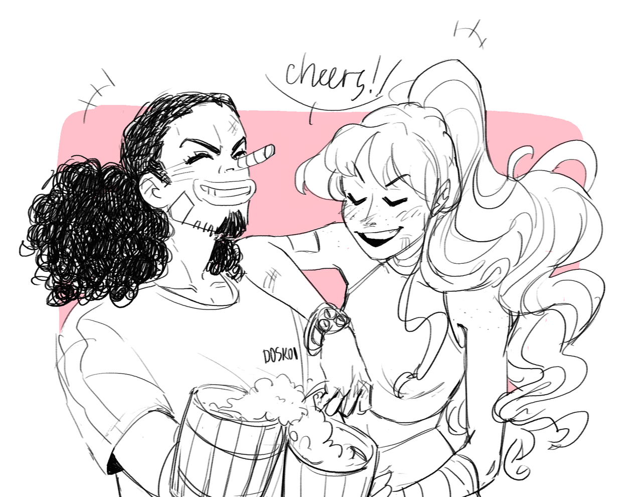 1boy 1girl ^_^ bracelet closed_eyes commentary cup english_commentary facial_hair goatee greyscale_with_colored_background halter_shirt halterneck holding holding_cup jewelry kimpimpam log_pose long_nose nami_(one_piece) one_piece pink_background ponytail smile upper_body usopp