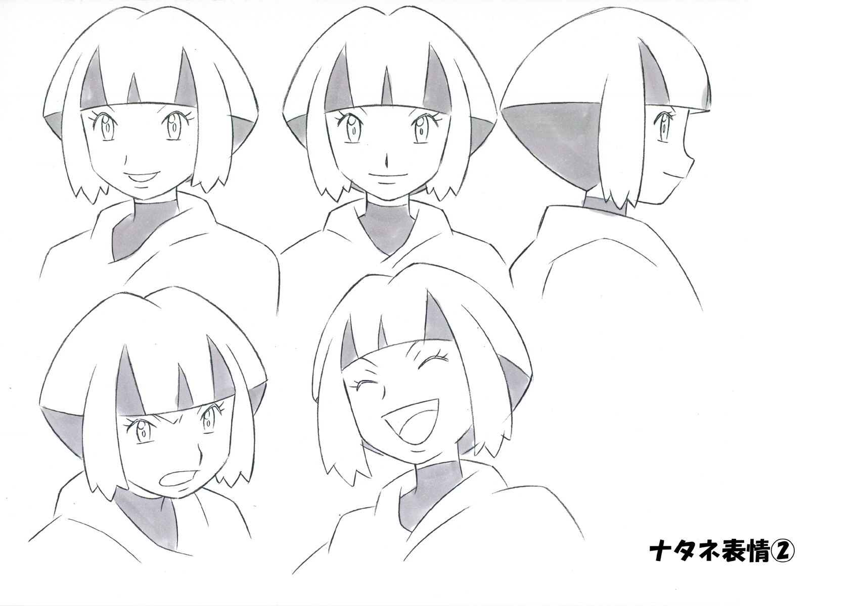 00s 1girl 2024_pokemon_teraleak bob_cut concept_art gardenia_(pokemon) highres monochrome multicolored_hair multiple_views nintendo non-web_source official_art pokemon pokemon_(anime) pokemon_the_series:_diamond_and_pearl reference_sheet short_hair smile translation_request turnaround two-tone_hair upper_body white_background