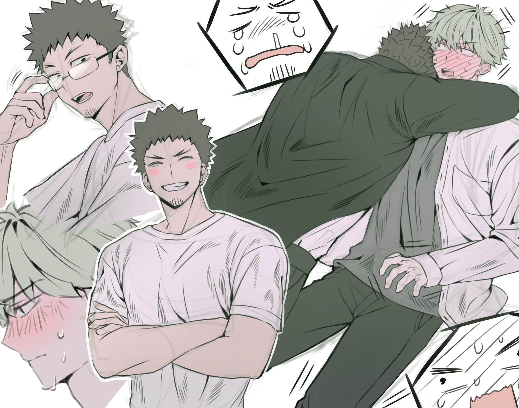 2boys adjusting_eyewear black_coat black_pants blush breast_pocket brown_hair buttons closed_eyes closed_mouth coat commentary_request crew_neck crossed_arms crying embarrassed facial_hair forked_eyebrows full-face_blush glasses goatee gomang1201 grey_hair grey_shirt grin hair_between_eyes hibino_kafka highres hug ichikawa_reno kaijuu_no._8 long_sleeves male_focus multiple_boys multiple_views nervous nervous_sweating open_clothes open_mouth open_shirt pants pocket rectangular_eyewear rimless_eyewear shirt short_hair short_sleeves simple_background sleeve_cuffs smile spiked_hair sweat sweatdrop t-shirt teeth wavy_mouth white_background white_shirt yaoi