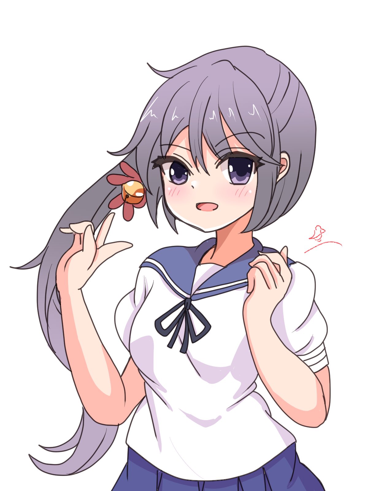 1girl akebono_(kancolle) bell blue_neckerchief blue_skirt flower grey_hair hair_flower hair_ornament highres ichijou_tsubame jingle_bell kantai_collection neckerchief pleated_skirt purple_eyes purple_sailor_collar sailor_collar school_uniform serafuku side_ponytail simple_background skirt solo upper_body white_background