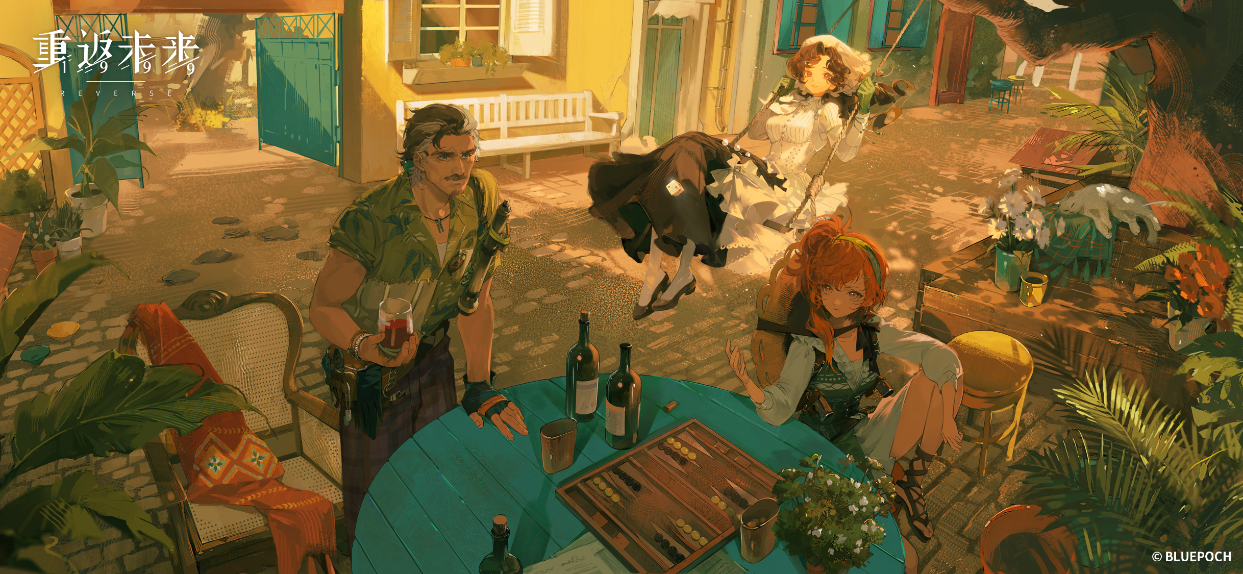 1boy 2girls alcohol anjo_nala backgammon beard_stubble black_footwear black_gloves black_hair black_skirt bottle breasts brick_floor brown_hat brown_pants coif collared_shirt cup day drinking_glass facial_hair feet_out_of_frame fingerless_gloves gloves green_eyes green_gloves green_shirt green_vest hand_on_table hat hat_on_back highres holding holding_cup house knee_up long_hair long_skirt long_sleeves looking_ahead looking_to_the_side lopera_(reverse:1999) mature_male medium_breasts medium_hair mr._duncan_(reverse:1999) multicolored_hair multiple_girls mustache old old_man on_stool on_swing orange_eyes orange_hair outdoors pants pantyhose plant potted_plant purple_eyes reverse:1999 round_table sandals shirt short_hair short_sleeves side_ponytail single_glove sitting skirt stool straw_hat streaked_hair stubble swing swinging swinging_on_swing table tree vest white_footwear white_hair white_hat white_pantyhose white_shirt wine wine_bottle wine_glass