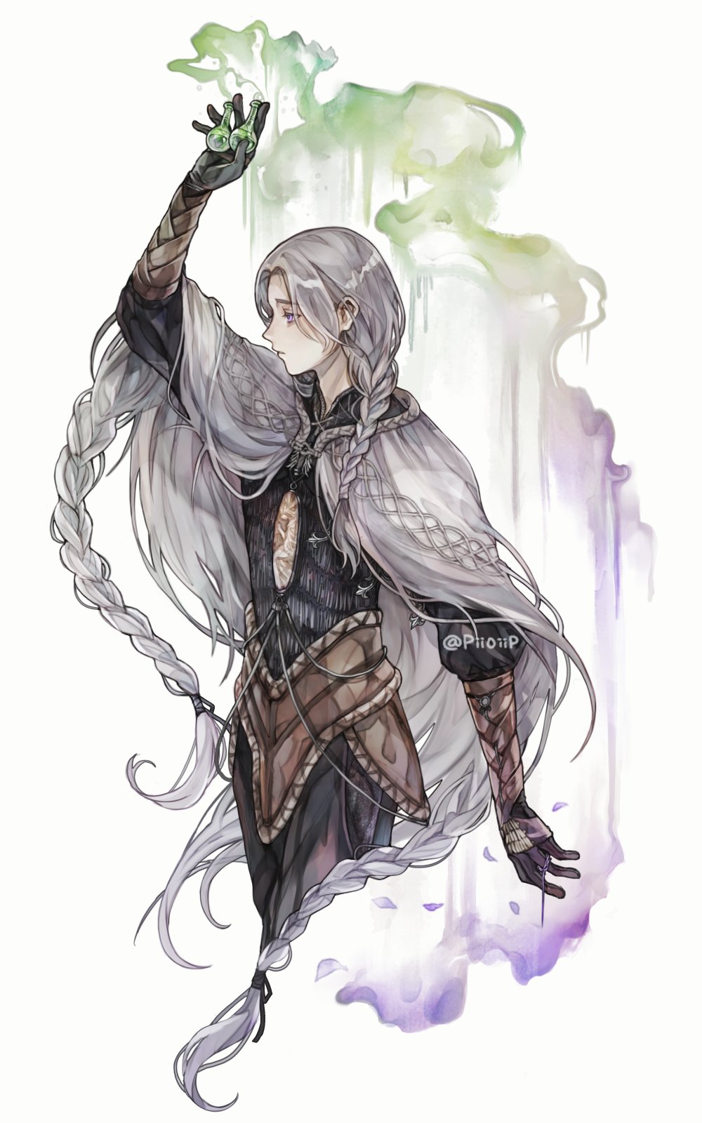 1boy braid capelet commentary_request cropped_legs elden_ring elden_ring:_shadow_of_the_erdtree fog grey_capelet grey_hair highres holding holding_potion holding_vial long_hair male_focus no_mask parted_lips pii0iip poison purple_eyes solo thiollier_(elden_ring) vial white_background