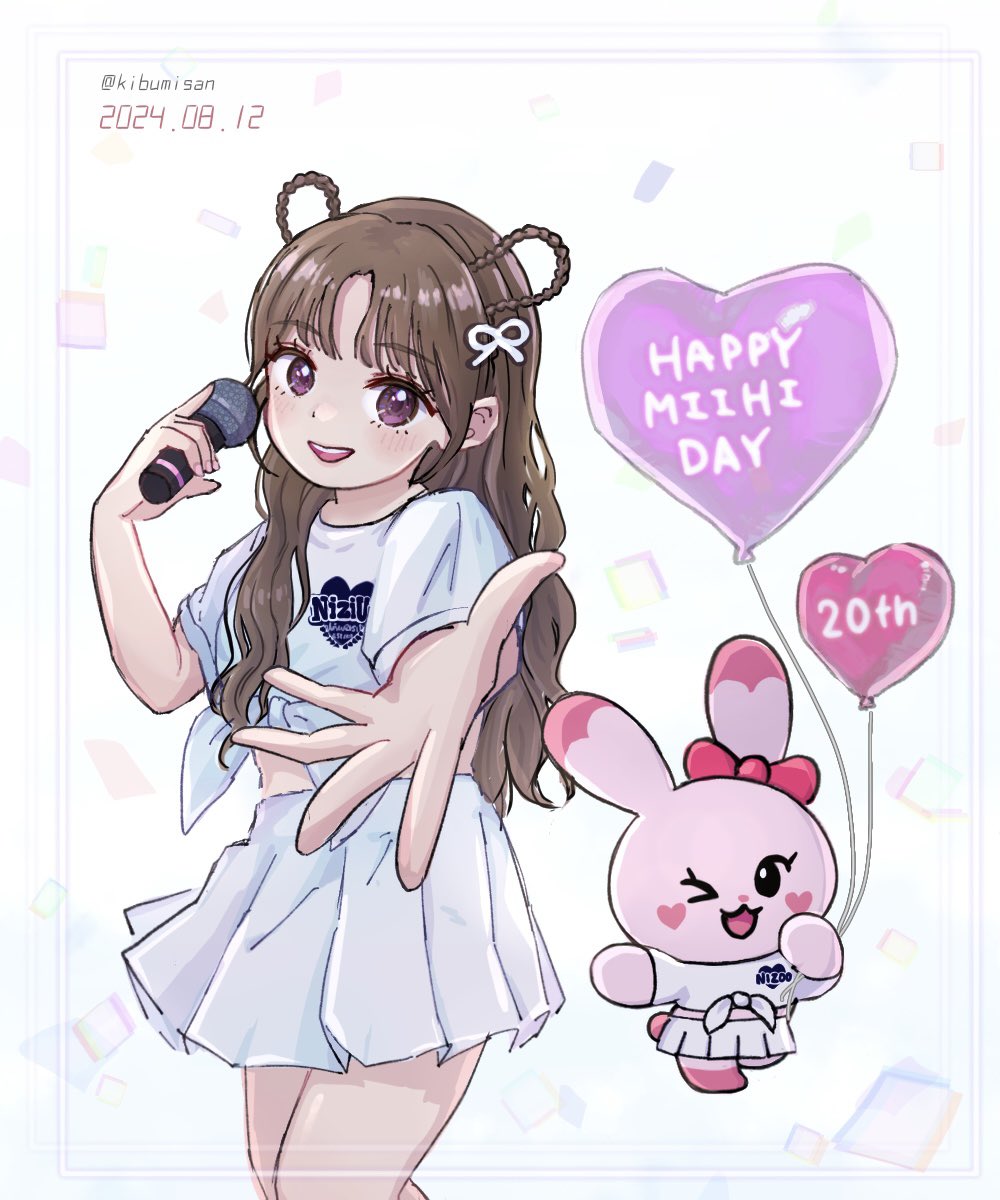 1girl animification balloon brown_hair character_name copyright_name happy_birthday heart_balloon highres holding holding_microphone kibumi long_hair microphone niziu open_hand open_mouth outstretched_arm pleated_skirt purple_eyes real_life shirt skirt smile solo suzuno_miihi tied_shirt white_shirt