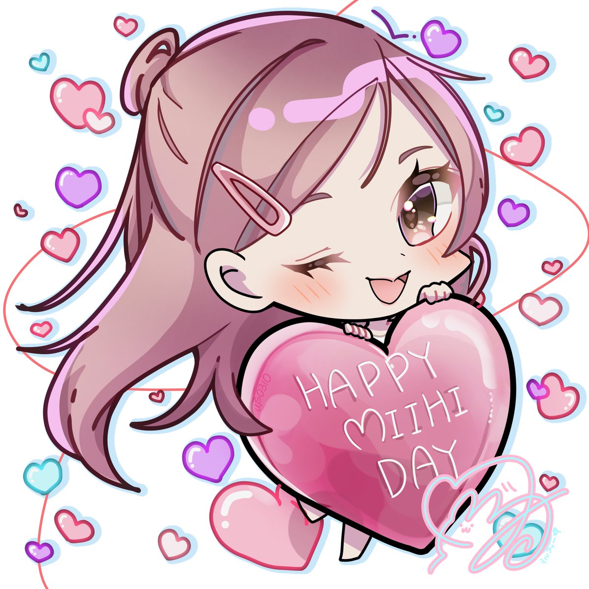 1girl animification blush brown_eyes chibi commentary drop_shadow hair_ornament hairclip happy_birthday heart highres holding long_hair looking_at_viewer milfeulle_(us0310_) niziu real_life signature smile solo suzuno_miihi untranslatable_commentary very_long_hair white_background