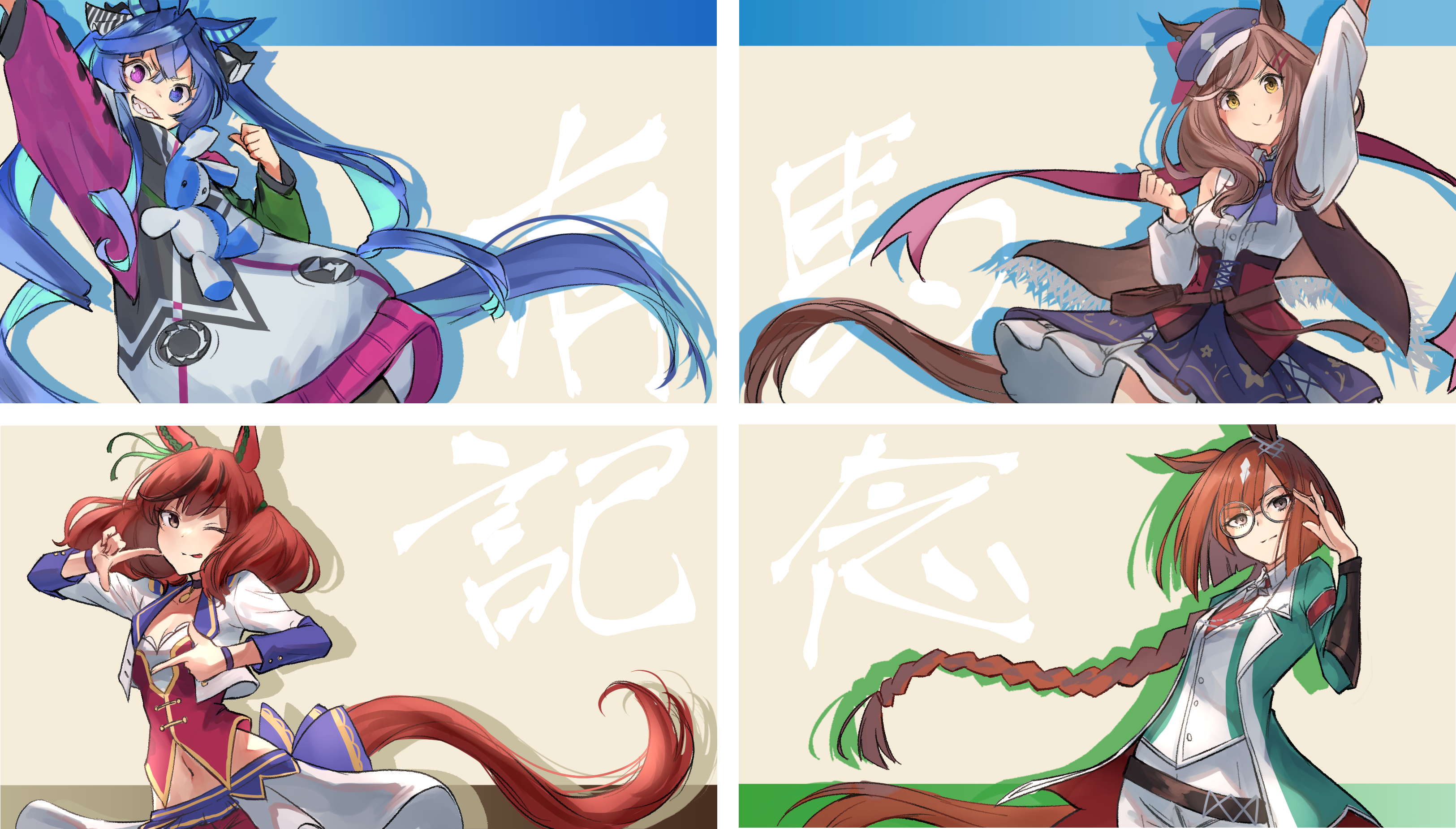 4girls ;p absurdres adjusting_eyewear ahoge animal_ears aqua_hair arm_up belt black_belt black_choker black_ribbon blue_eyes blue_hair blue_skirt bob_cut braid braided_ponytail brown_belt brown_eyes brown_hair choker clenched_hand closed_mouth clothing_cutout coat commentary cropped_jacket crossed_bangs dress_shirt ear_covers ears_through_headwear glasses green_coat grey-framed_eyewear grey_eyes grin hair_ornament hair_ribbon hair_tie hairclip hat heterochromia highres horse_ears horse_girl horse_tail ikuno_dictus_(mantle_of_steel)_(umamusume) ikuno_dictus_(umamusume) index_finger_raised jacket long_coat long_hair long_sleeves looking_at_viewer matikanetannhauser_(clippety-tippety-clop)_(umamusume) matikanetannhauser_(umamusume) medium_hair medium_skirt midriff multicolored_coat multicolored_hair multiple_girls navel necktie newsboy_cap nice_nature_(umamusume) one_eye_closed one_side_up overskirt pants pouch purple_eyes purple_scarf red_necktie red_shorts red_vest ribbon round_eyewear sassakntm scarf shadow sharp_teeth shirt shorts shoulder_cutout sidelocks single_braid skirt smile standing starting_future_(umamusume) streaked_hair stuffed_animal stuffed_rabbit stuffed_toy tail teeth tilted_headwear tongue tongue_out translated twin_turbo_(blast_mode!_turbo_engine)_(umamusume) twin_turbo_(umamusume) twintails two-tone_hair umamusume underbust very_long_hair vest white_jacket white_pants white_shirt white_skirt white_vest yellow_eyes