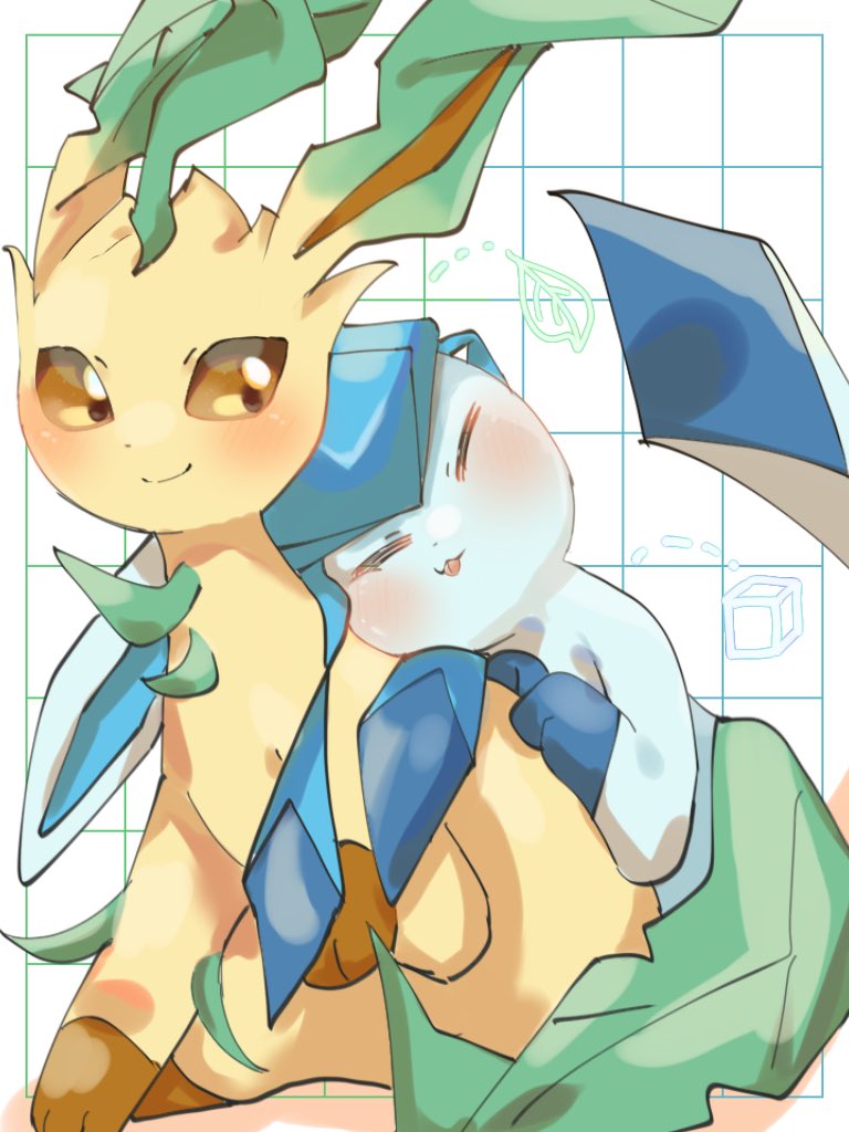 blue_hair brown_eyes closed_eyes commentary_request gen_4_pokemon glaceon hp7car7nxrq5s7q ice leaf leafeon long_hair nintendo pokemon pokemon_(creature) sidelocks sitting smile tongue tongue_out
