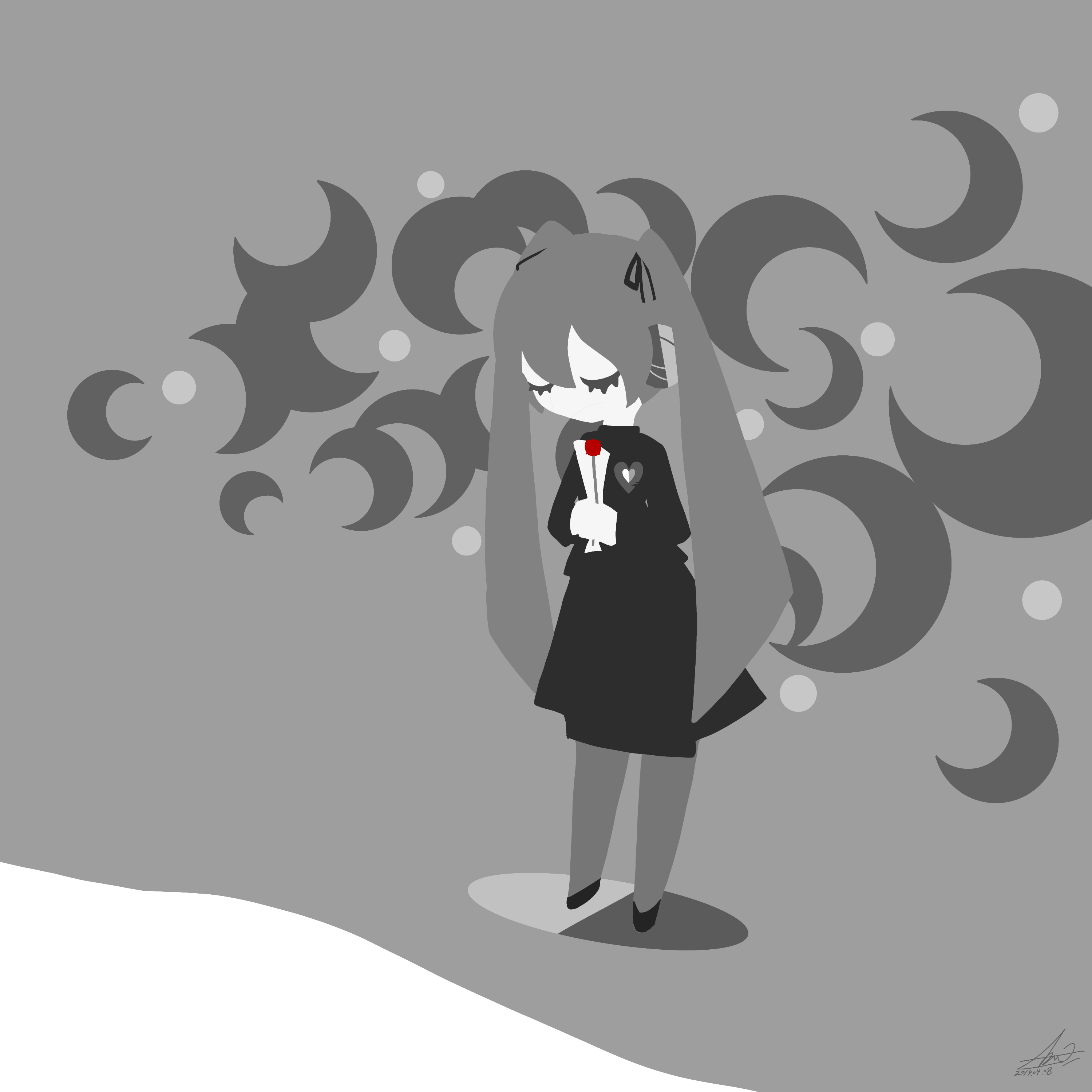 absurdres black_dress black_footwear closed_eyes dress flower full_body getemonooki_ackey grey_hair grey_pantyhose greyscale hair_between_eyes hair_ribbon hatsune_miku headphones heart highres holding holding_flower monochrome pantyhose red_flower red_rose ribbon rolling_girl_(vocaloid) rose signature simple_background spot_color standing unhappy_refrain_(vocaloid) ura-omote_lovers_(vocaloid) vocaloid