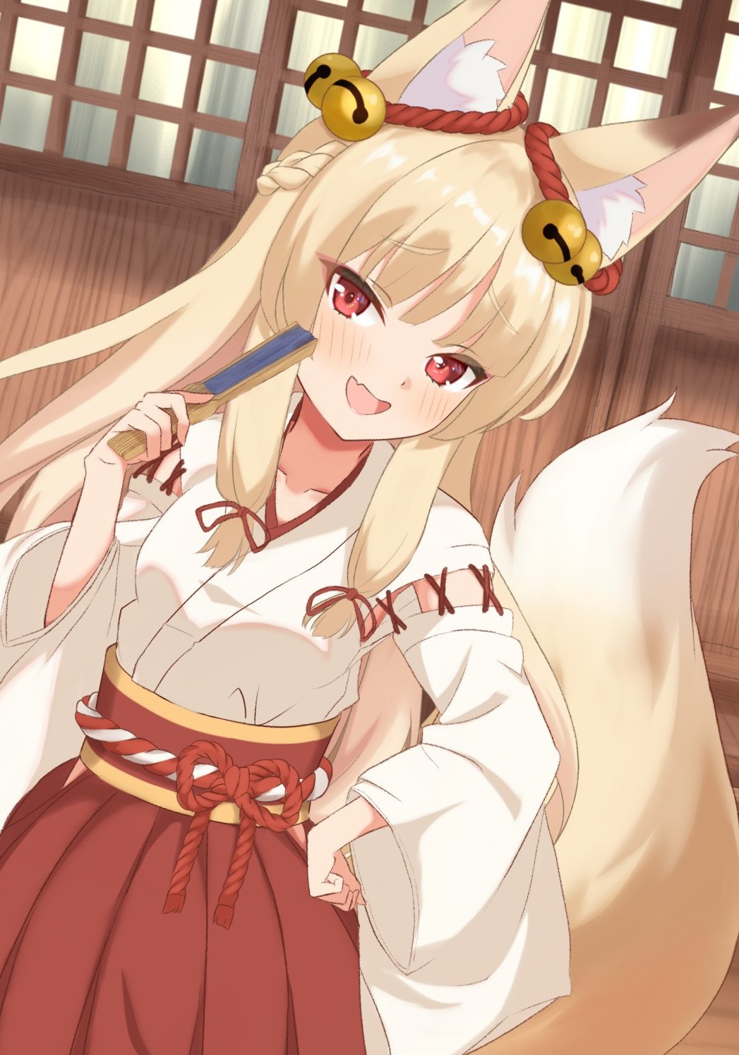 1girl :d animal_ear_fluff animal_ears bell blonde_hair braid commentary_request ear_bell folded_fan folding_fan fox_ears fox_girl fox_tail hakama hakama_skirt hand_fan hand_on_own_hip hand_up head_tilt highres holding holding_fan japanese_clothes jingle_bell kimono long_hair long_sleeves looking_at_viewer open_mouth original red_eyes red_hakama rodo_(oekakisyakaijin) skirt smile solo tail very_long_hair white_kimono wide_sleeves
