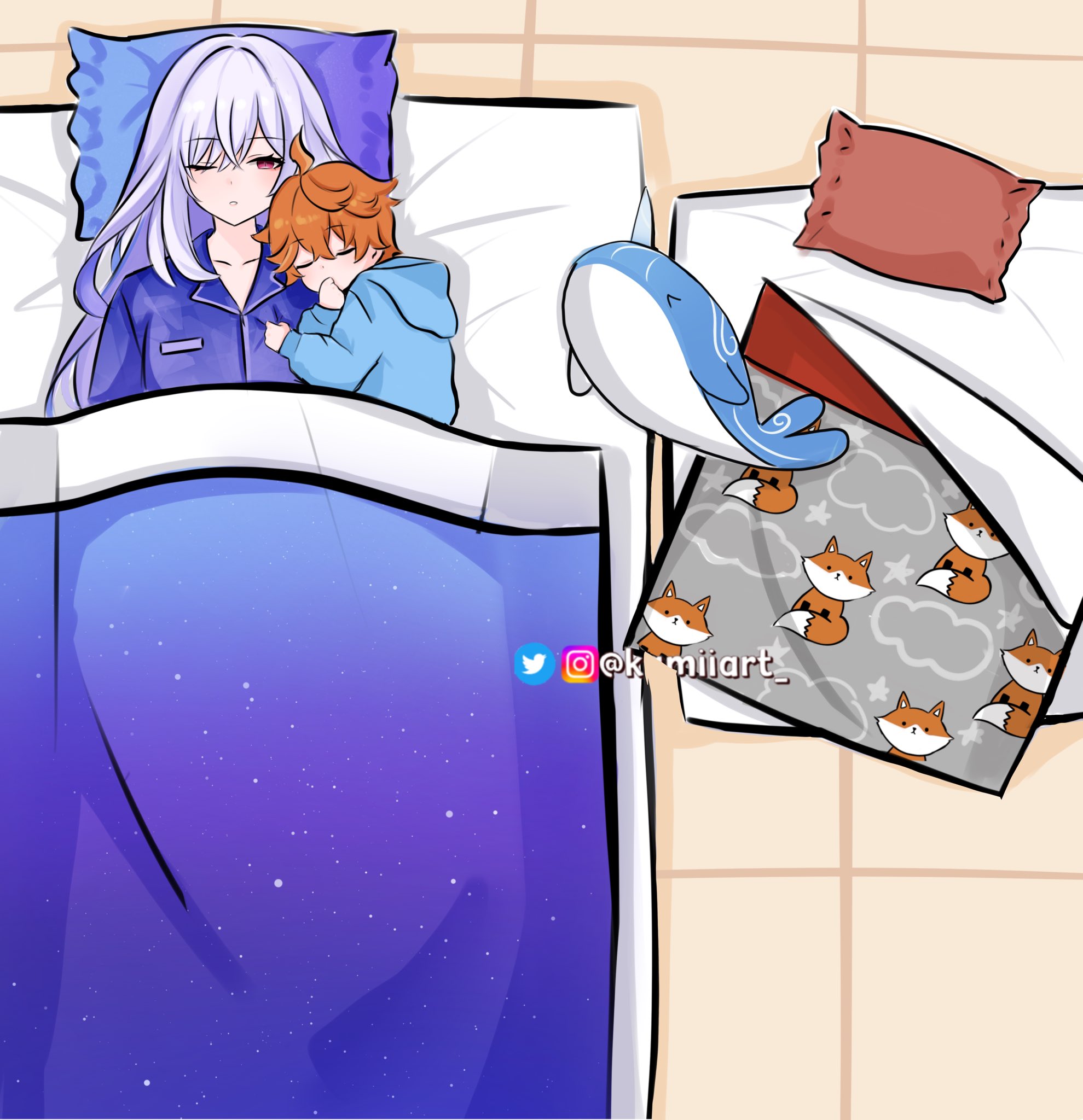 1boy 1girl aged_down artist_name blanket closed_eyes closed_mouth finger_sucking floor fox futon galaxy genshin_impact highres instagram_logo instagram_username kamiiart looking_at_viewer lying on_back one_eye_closed orange_hair pajamas pillow purple_hair red_eyes skirk_(genshin_impact) sleeping tartaglia_(genshin_impact) twitter_logo twitter_username whale