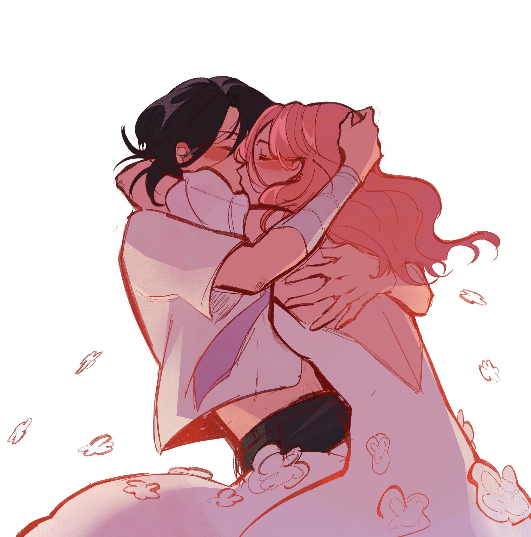 2girls arms_around_neck backless_dress backless_outfit bandaged_wrist bandages black_hair closed_eyes commentary dress english_commentary female_focus hegaiii highres kininatteru_hito_ga_otoko_ja_nakatta kiss koga_mitsuki long_hair multiple_girls oosawa_aya pink_hair shirt short_sleeves simple_background wedding_dress white_background white_dress white_shirt wife_and_wife yuri