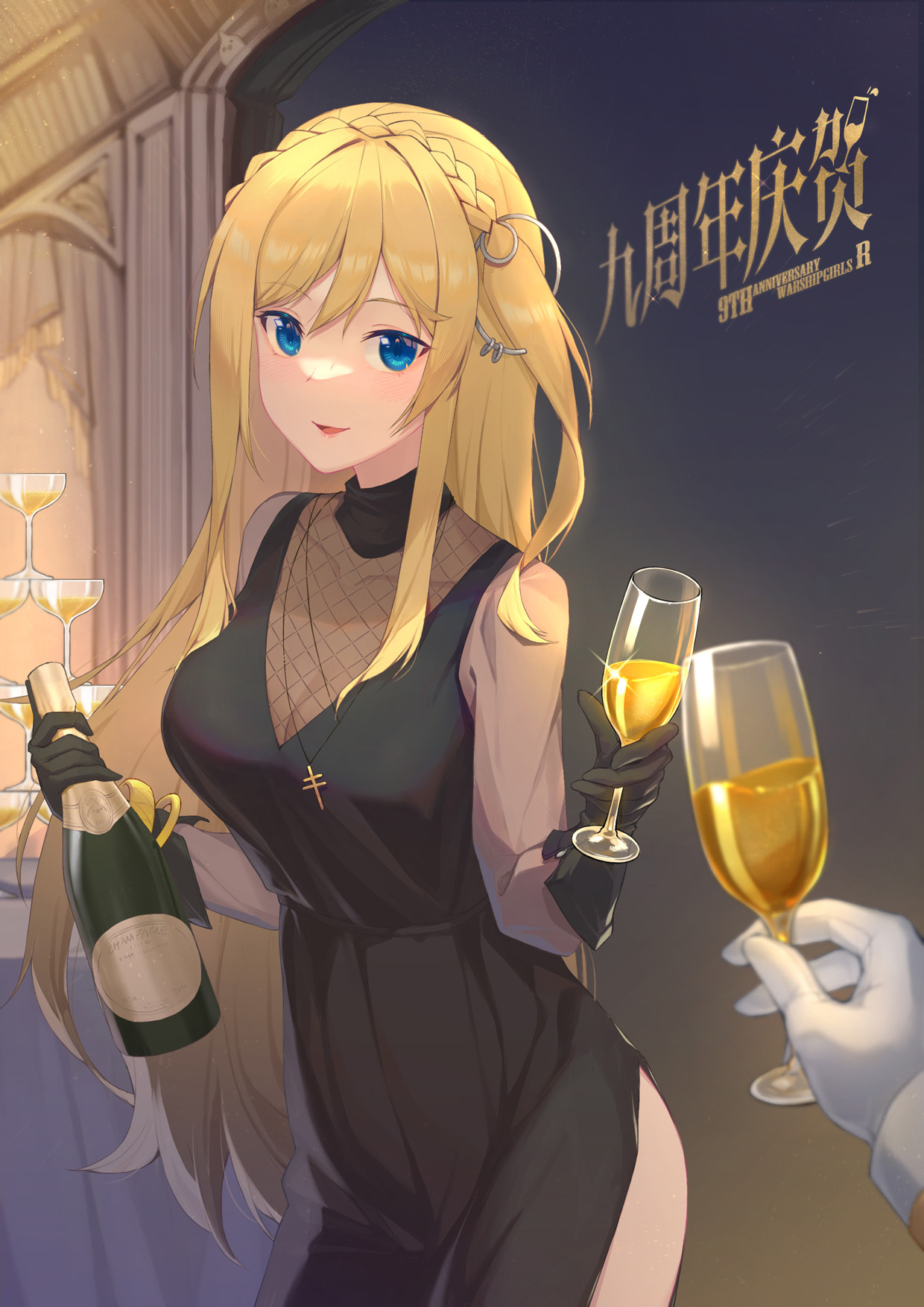 1girl alcohol anniversary black_dress black_gloves blonde_hair blue_eyes blush bottle braid breasts champagne_flute chinese_text cleavage copyright_name cowboy_shot crown_braid cup dress drinking_glass e_neko english_text gloves hair_ornament highres holding holding_cup indoors jewelry large_breasts long_hair looking_at_viewer mixed-language_text necklace one_side_up open_mouth parted_lips pov richelieu_(warship_girls_r) see-through_clothes side_slit smile solo_focus standing warship_girls_r wine wine_bottle wine_glass