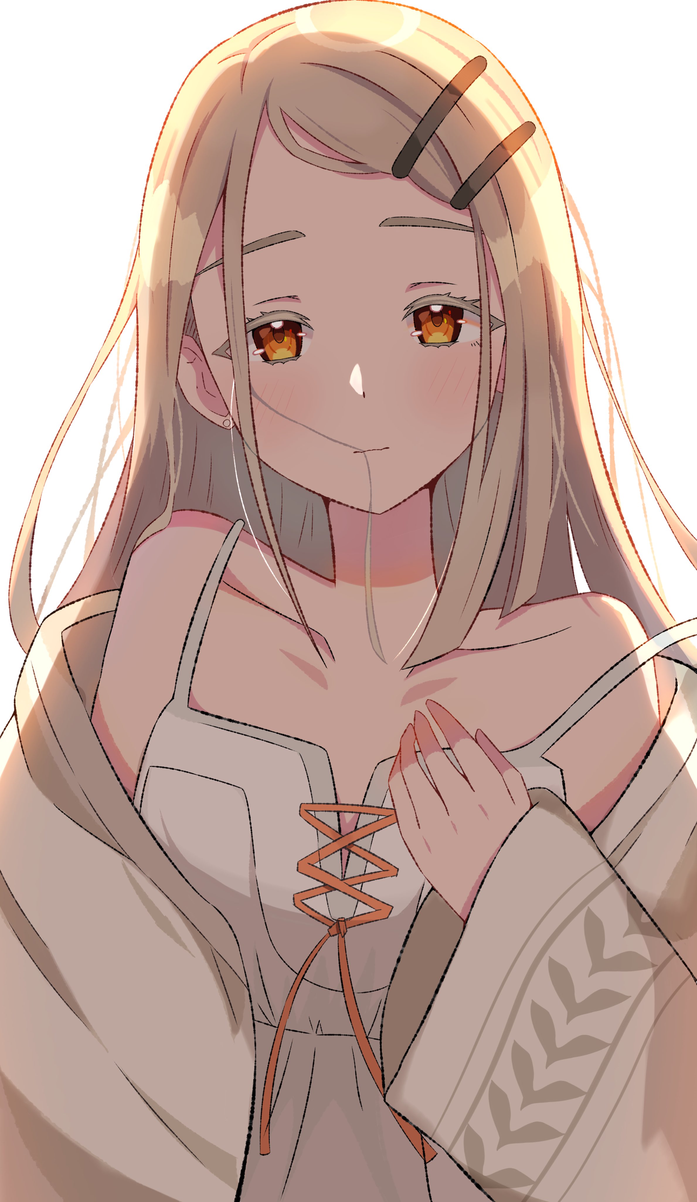 1girl absurdres backlighting bare_shoulders blonde_hair blush camisole closed_mouth collarbone colored_eyelashes dot_nose flat_chest flipped_hair gakuen_idolmaster hair_in_own_mouth hair_ornament hairclip hand_on_own_chest hand_up highres idolmaster iroha_822 jacket long_hair long_sleeves looking_at_viewer off_shoulder open_clothes open_jacket orange_eyes shinosawa_hiro simple_background solo strap_slip upper_body white_background white_camisole white_jacket