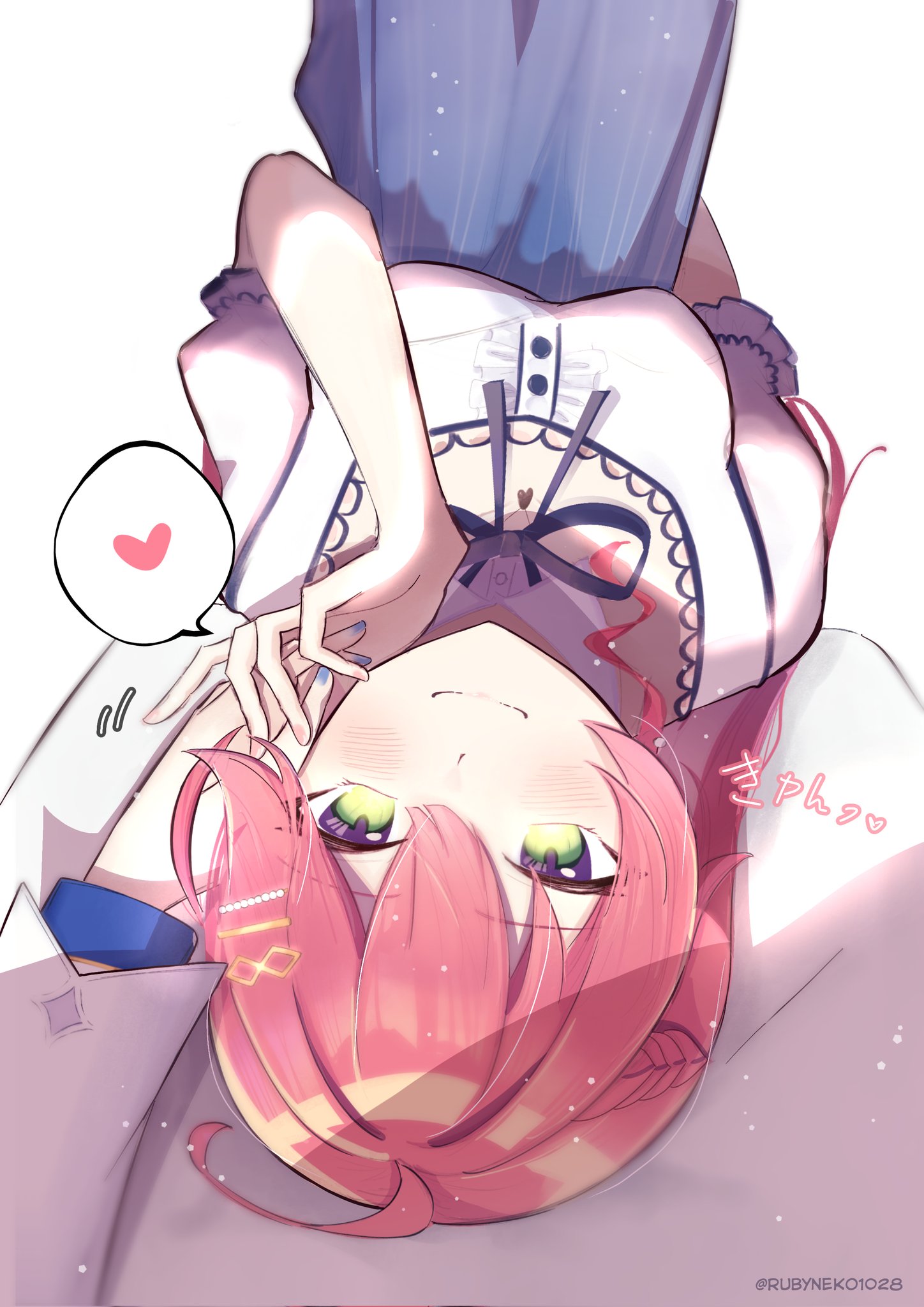 2girls ahoge black_ribbon blue_nails blue_skirt blush breasts closed_mouth dress green_eyes hair_between_eyes hair_ornament hairclip hand_on_another's_cheek hand_on_another's_face heart highres hololive hoshimachi_suisei hoshimachi_suisei_(oriental_suit) jewelry lap_pillow long_hair long_skirt long_sleeves medium_breasts multiple_girls neck_ribbon necklace pink_hair pink_nails pov pov_hands puffy_short_sleeves puffy_sleeves ribbon ruby_(rubyneko1028) sakura_miko sakura_miko_(street) short_dress short_sleeves skirt smile spoken_heart striped_clothes striped_skirt twitter_username upside-down vertical-striped_clothes vertical-striped_skirt virtual_youtuber white_dress white_skirt wrist_cuffs yuri