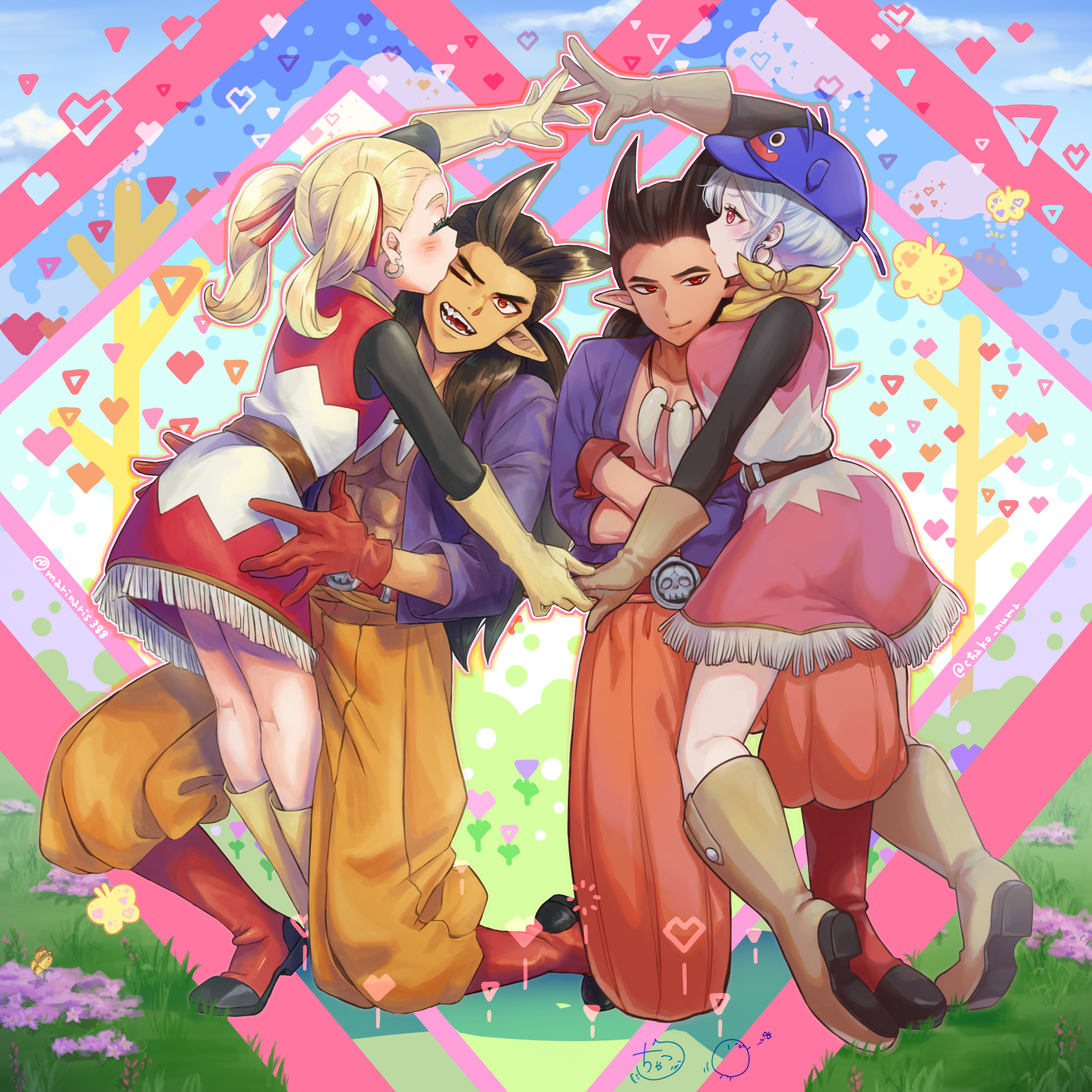 2boys 2girls abs antenna_hair artist_collaboration blonde_hair blue_hair bone_necklace boots brown_footwear brown_gloves brown_hair bug butterfly chako_numa closed_eyes closed_mouth commentary_request crossed_arms dark-skinned_male dark_skin dracky dragon_quest dragon_quest_builders_2 dress dual_persona earrings female_builder_(dqb2) fringe_trim gloves grass hair_pulled_back hair_ribbon hat heart highres hoop_earrings insect jewelry looking_at_another low_ponytail marisuke_(marippe) multiple_boys multiple_girls muscular muscular_male neckerchief on_one_knee one_eye_closed open_clothes open_mouth open_shirt orange_pants pants pink_eyes pointy_ears ponytail purple_shirt red_footwear red_gloves red_ribbon ribbon sharp_teeth shirt sidoh_(dqb2) signature silver_earrings skull_belt smirk spiked_hair teeth twintails twitter_username yellow_boots yellow_gloves yellow_neckerchief