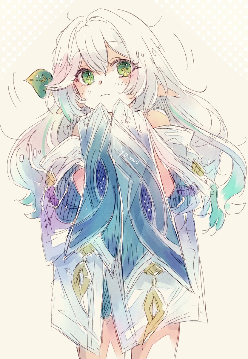 1girl alternate_hairstyle animal_print aqua_sleeves artist_name bird_print blush borrowed_clothes closed_mouth cosplay cross-shaped_pupils double-parted_bangs eyelashes genshin_impact green_eyes green_hair green_pupils hair_between_eyes hair_down hair_intakes hair_ornament highres japanese_clothes kimono layered_sleeves leaf leaf_hair_ornament legs_together long_hair looking_at_viewer loose_hair_strand multicolored_hair nahida_(genshin_impact) off_shoulder pointy_ears purple_rope rope scaramouche_(genshin_impact) short_sleeves sketch solo split_mouth streaked_hair symbol-shaped_pupils thigh_gap upper_body wanderer_(genshin_impact) wanderer_(genshin_impact)_(cosplay) white_background white_hair white_kimono white_sleeves yamo_(sky2world)