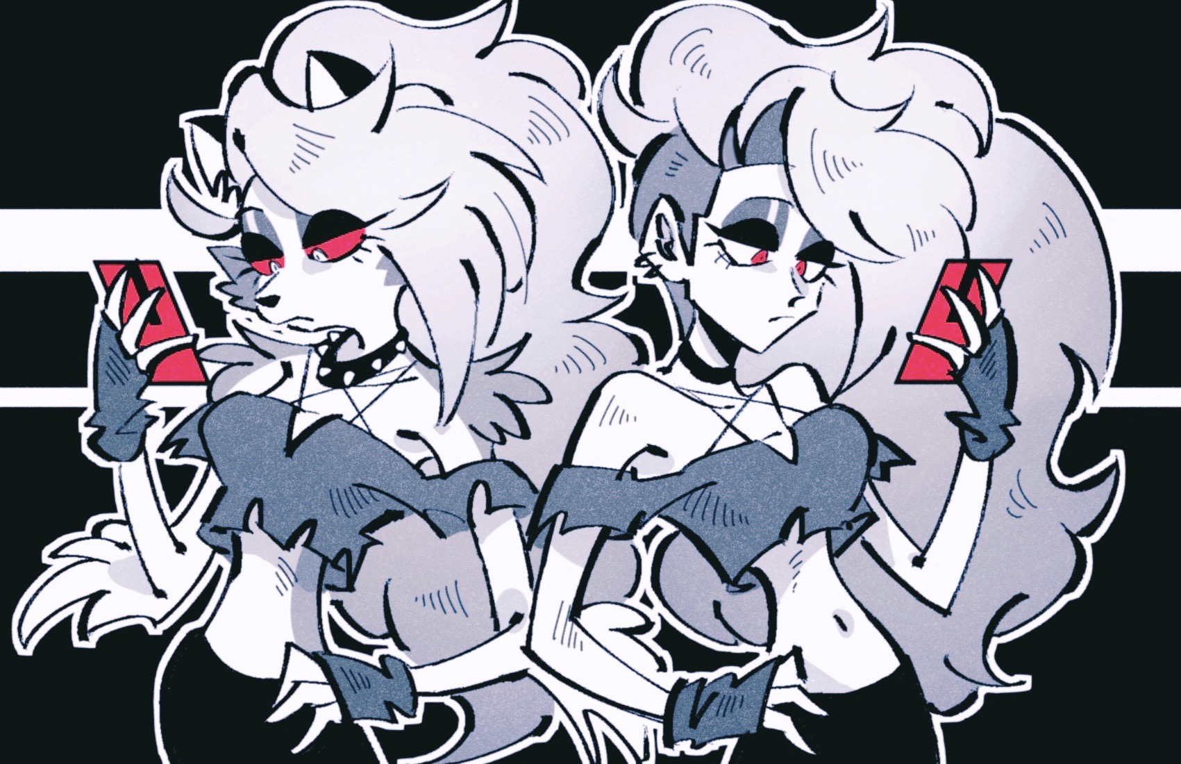 animal_ears crop_top dog_ears dog_girl dog_tail fingerless_gloves furry furry_female gloves hellaverse helluva_boss highres long_hair loona_(helluva_boss) red_eyes tail white_hair yasutak1192
