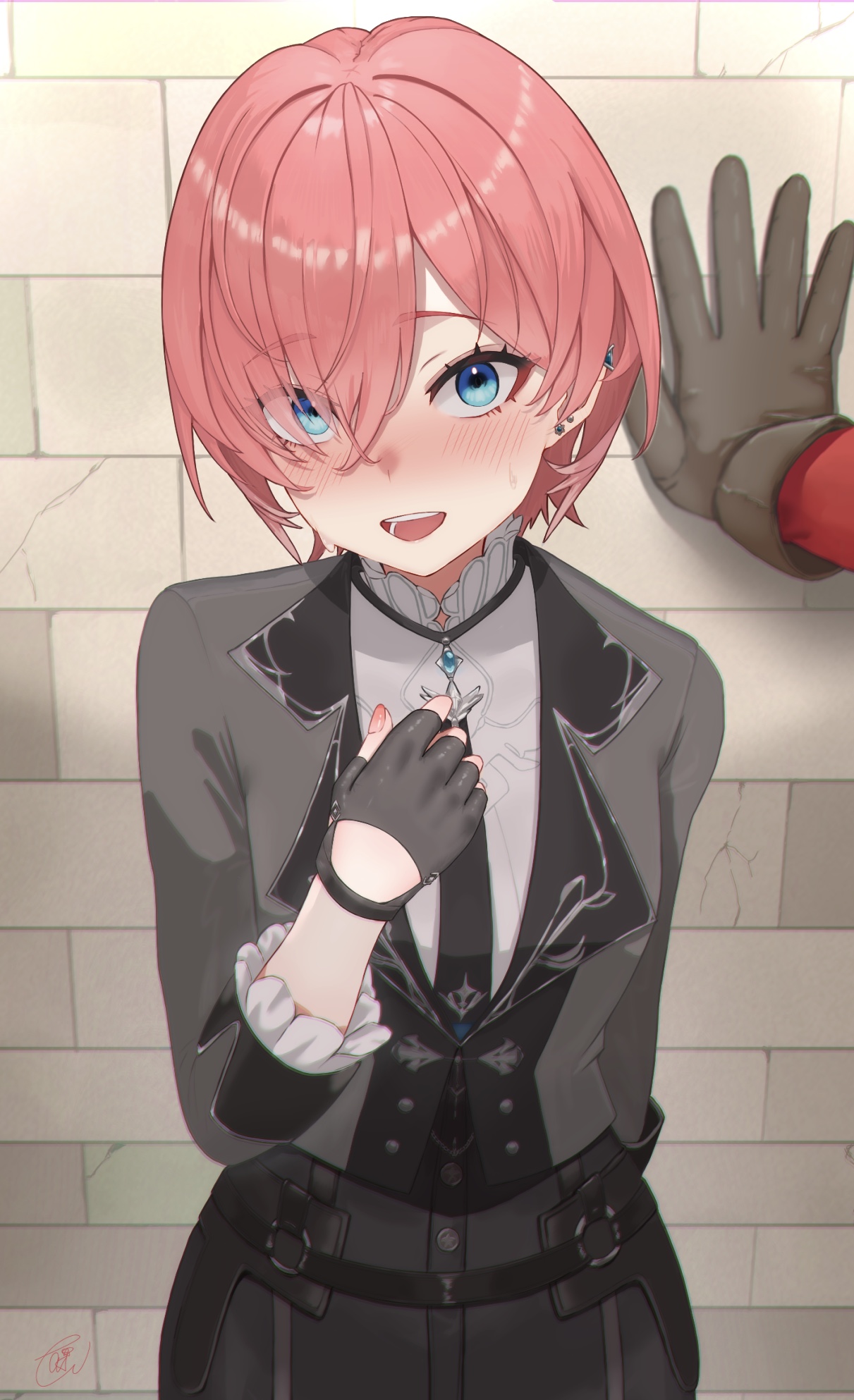 1girl 1other against_wall alternate_costume arm_behind_back blue_eyes blush brick_wall coat embarrassed fancy_suit fingerless_gloves flirting formal_clothes gloves highres hololive nails open_mouth pink_hair pov short_hair smile suit suspenders takane_lui takion virtual_youtuber