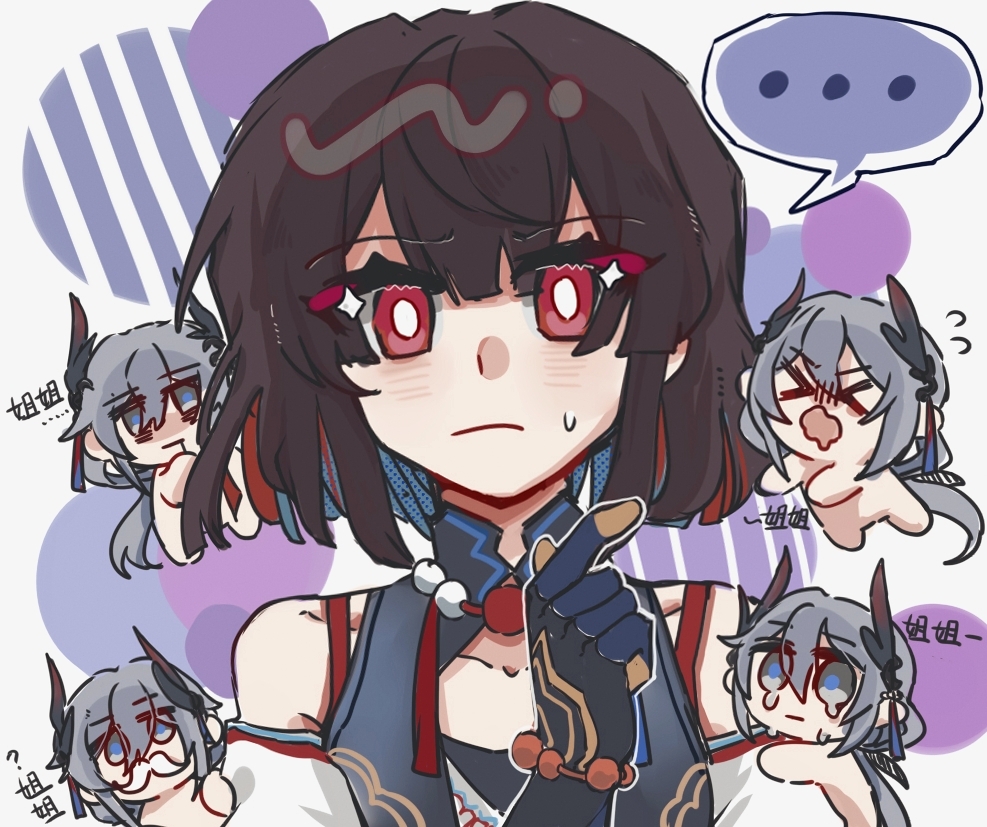 >_< ... bare_shoulders bilizinger black_gloves blue_hair blue_pupils bright_pupils brown_hair chinese_commentary closed_mouth collarbone colored_inner_hair commentary_request crying crying_with_eyes_open fake_facial_hair fake_mustache feather_hair_ornament feathers flying_sweatdrops gloves grey_eyes grey_hair hair_between_eyes hair_ornament hanya_(honkai:_star_rail) honkai:_star_rail honkai_(series) looking_at_another looking_at_viewer mini_person multicolored_hair red_eyes red_hair siblings sisters spoken_ellipsis tears translation_request white_pupils xueyi_(honkai:_star_rail)